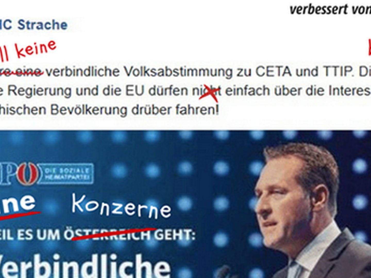 Pikant: Die FPÖ, die der SPÖ in der Vergangenheit immer vorgeworfen hatte, beim Thema CETA umgefallen zu sein, wird von den Sozialdemokraten nun nach allen Regeln der Kunst aufs Korn genommen. So etwa von der SPÖ Niederösterreich, welche einen Facebook-Post von HC Strache korrigierte, wie “heute.at” berichtet. Mittels Rotstift machen sich die Sozialdemokraten über die FPÖ lustig. Der Beitrag wurde in kürzester Zeit bereits 600 Mal geteilt.