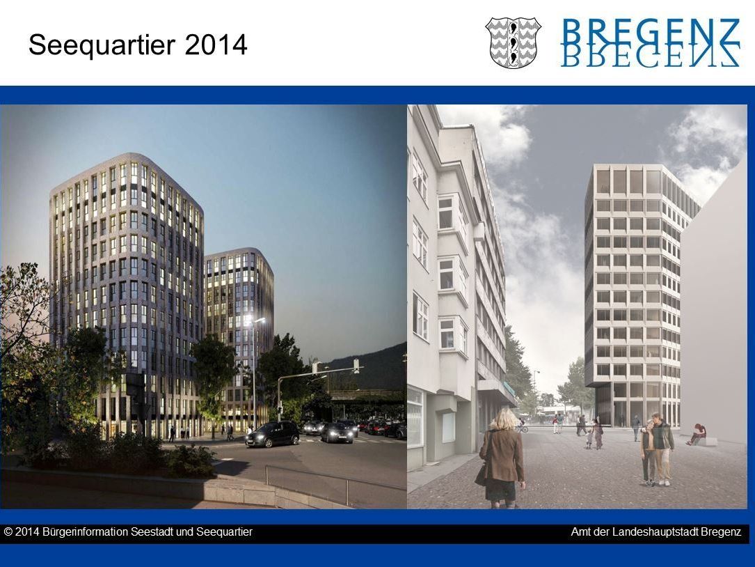 Im Dezember soll die Seestadt zur Begutachtung bei der Stadt eingereicht werden. Mit einem Baubeginn rechnet Ölz im Frühjahr 2015 – und damit nach den Gemeinderatswahlen, wie Ritsch anmerkt. “Ich bin seit 1988 in der Politik und bereits damals war die Seestadt ein Wahlkampfthema.” Sobald die Arbeiten an der Tiefgarage unter der Seestadt abgeschlossen sind, folgen im Sommer 2016 der neue Bahnhof, das Busterminal und die Zwillingstürme. Als letztes werden die Wohnblöcke des Seequartiers umgesetzt. Die Seestadt soll dann innerhalb von zwei Jahren errichtet werden. Das Seequartier soll mit 2019 bis 2020 fertig gestellt sein.