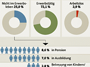 Der Anteil der Arbeitswilligen unter ihnen ist der höchste unter den verglichenen Ländern. Dabei sind in Österreich mit 7 Prozent unterdurchschnittlich wenige Erwachsene (15- bis 64-Jährige) in Ausbildung, in den anderen Staaten sind es 8 Prozent. Auch Krankheit ist mit 2,2 Prozent eine relativ seltene Ursache für Nicht-Erwerbstätigkeit (Durchschnitt 4,7 Prozent).