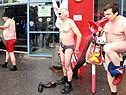 Drei Mutige folgten trotz nasskaltem Wetter der Aufforderung und zogen sich – Parolen gegen Politik und AMS schreiend – zusammen mit dem Initiator bis auf den Stringtanga aus.