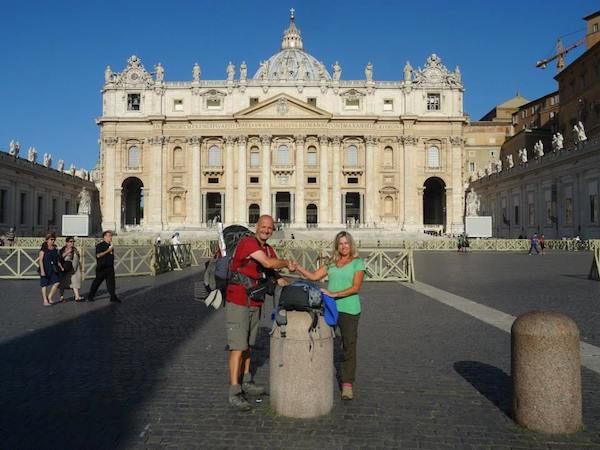 Gestern Abend gingen Antonia und ich noch fein essen. Wir zelebrierten unseren letzten gemeinsamen Pilgerabend. Wir aßen feine Shrimps und natürlich gute italienische Pasta. Dazu tranken wir einen guten Rotwein. Geschlafen habe ich danach wie ein Murmeltier, bis mich der Wecker heute um 04:15 Uhr aus dem Schlaf holte. Wir wollten heute noch früher starten, die letzten Kilometer nach Rom verlaufen an der Bundesstraße. Wenn man früh genug losläuft entgeht man dem größten Berufsverkehr. Wir kamen gut vorwärts obwohl wir uns leider kurz verliefen. Zum Glück bemerkte ich sehr rasch unseren Fehler, sodass unser Umweg nicht allzu groß war. Um 07:05 Uhr standen wir am Aussichtspunkt des „Park Riserva Naturale di Monte Mario“. Von hier aus hatten wir einen gigantischen Ausblick auf die ewige Stadt Rom. Ich muss ehrlich zugeben, dass ich eine Gänsehaut bekam. Es war ein wunderbares Gefühl, nach dieser für mich doch langen Wanderschaft mein Ziel so nahe zu sehen. 1.664 Kilometer liegen hinter mir, 380 Stunden und 46 Minuten reine Gehzeit. 28.790 Höhenmeter habe ich von Schwarzenberg bis hierher zurückgelegt. Ich war einfach nur happy! Nach diesem wundervollen Ausblick zog es Antonia und mich runter in Richtung Petersdom. Um 08:19 Uhr standen wir beim Obelisken am Petersplatz. Antonia und ich freuten uns riesig, wir beglückwünschten uns gegenseitig. Was war das für eine tolle Reise! Ich hatte so viele schöne Erlebnisse. Und ich hatte großes Wetterglück – gerade an den markanten Punkten wie zum Beispiel am Großen Sankt Bernhard. Nur 2 Tage später hatte es hier ja geschneit.