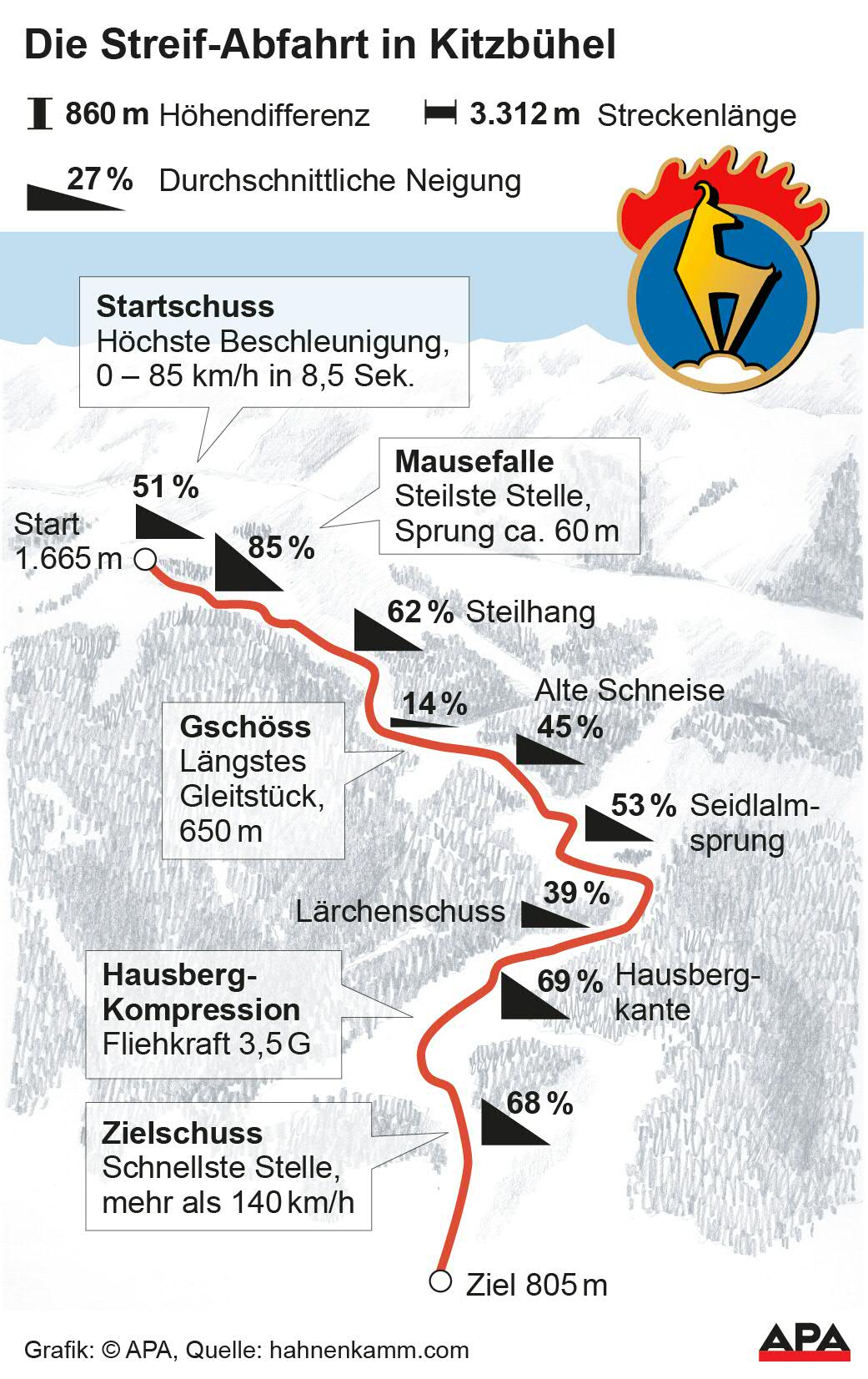 Mit bis zu 143 Kilometern pro Stunde rasen die Athleten dem Ziel entgegen. Vor dem Zielsprung, bei dem bis zu 70 Meter möglich sind, beschleunigen die Skifahrer noch einmal. Die Durchschnittsgeschwindigkeit der Hahnenkamm-Abfahrt beträgt 103 km/h.