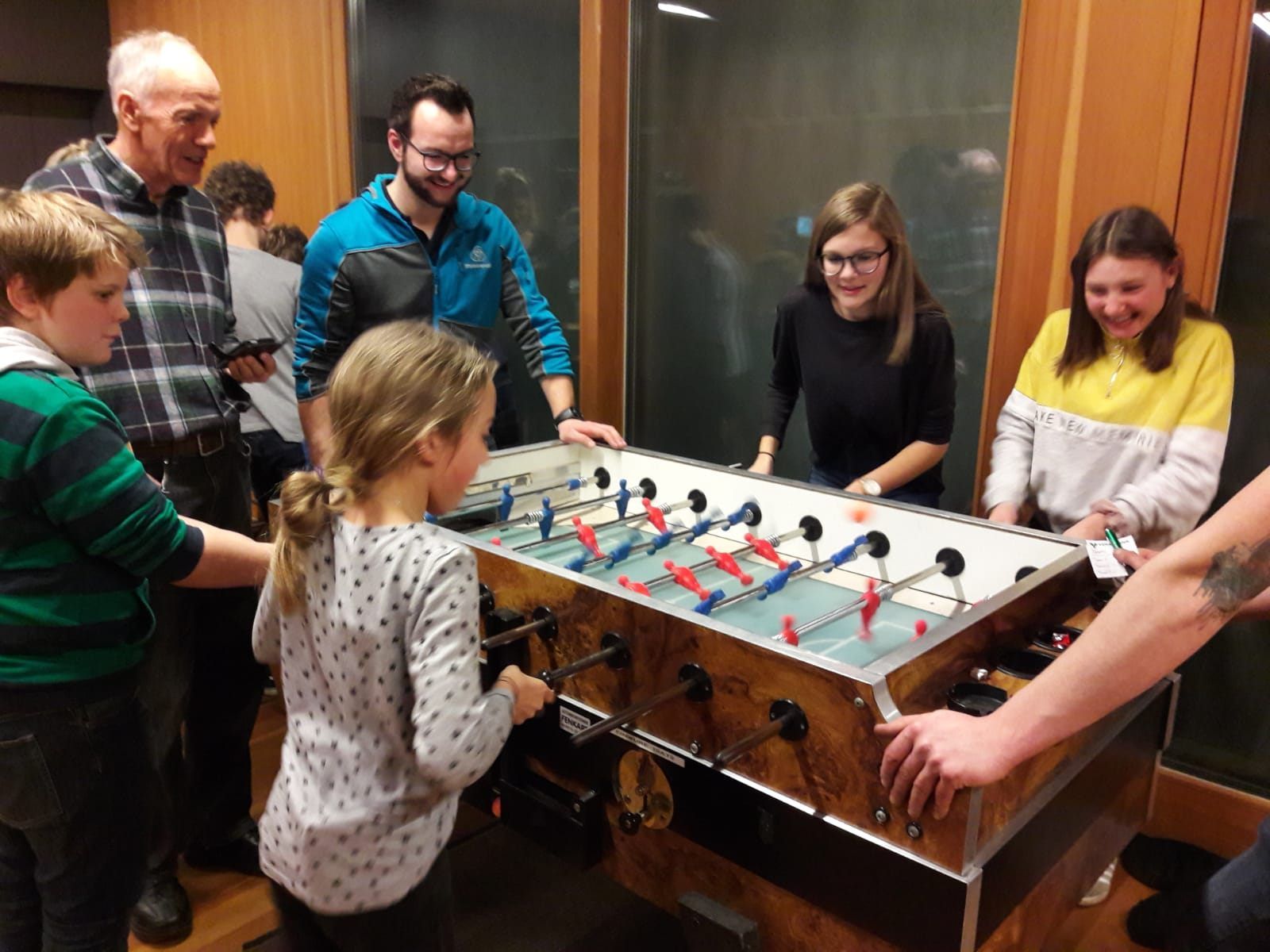 Den tollen Abend der Jahresversammlung ließen alle 11 teilnehmenden Jungmusikanten zusammen am beliebten Fußballtisch ausklingen.