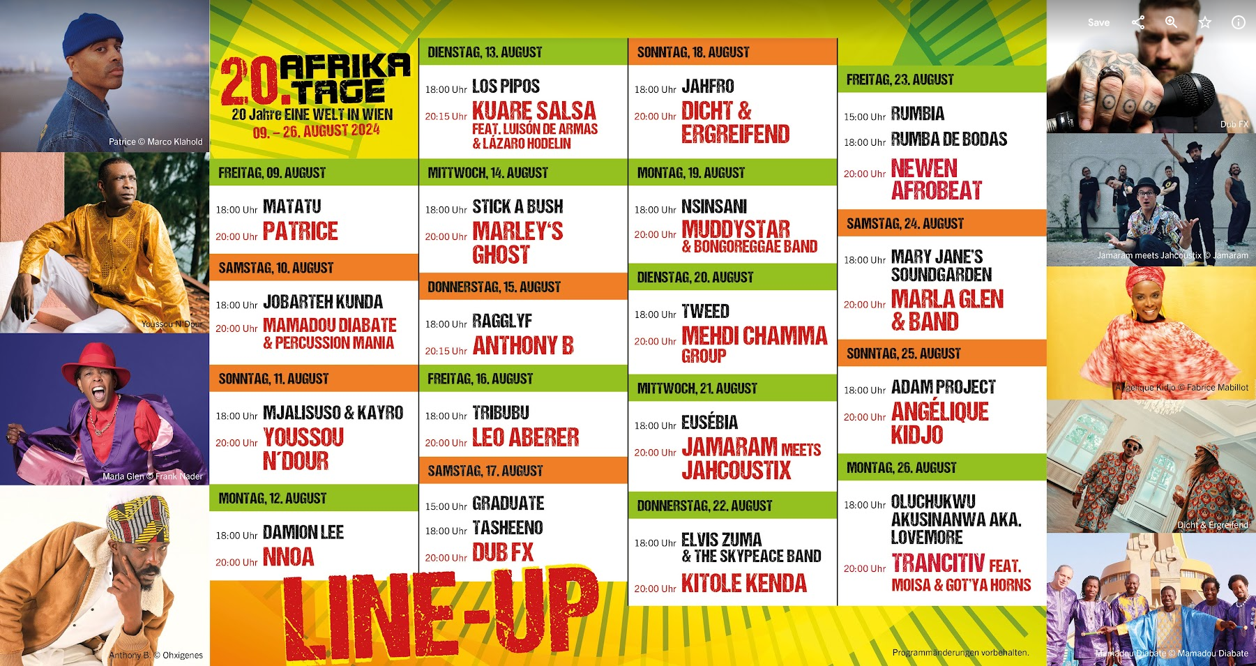 Vom 9. bis 26. August geht das "Festival der Kulturen" auf der Donauinsel über die Bühne. Angekündigt wurden Auftritte u.a. von Youssou N'Dour, Angélique Kidjo, Marla Glen mit Band, Patrice, Anthony B, Dub FX, Dicht & Ergreifend, Jamaram meets Jahcoustix, Mamadou Diabate und Percussion Mania sowie Newen Afrobeat. Dazu gibt es täglich Workshops, Gastronomie, Kinderprogramm, Shows und einen Basar.