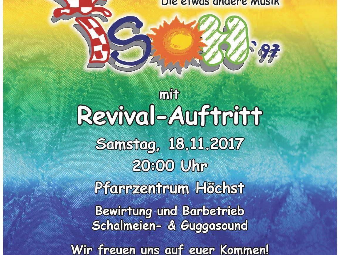 Aus diesem Grund laden wir alle recht herzlich zur großen Revival-Party ein, welche am 18.11.2017 ab 20:00 Uhr im Pfarrzentrum Höchst stattfindet.