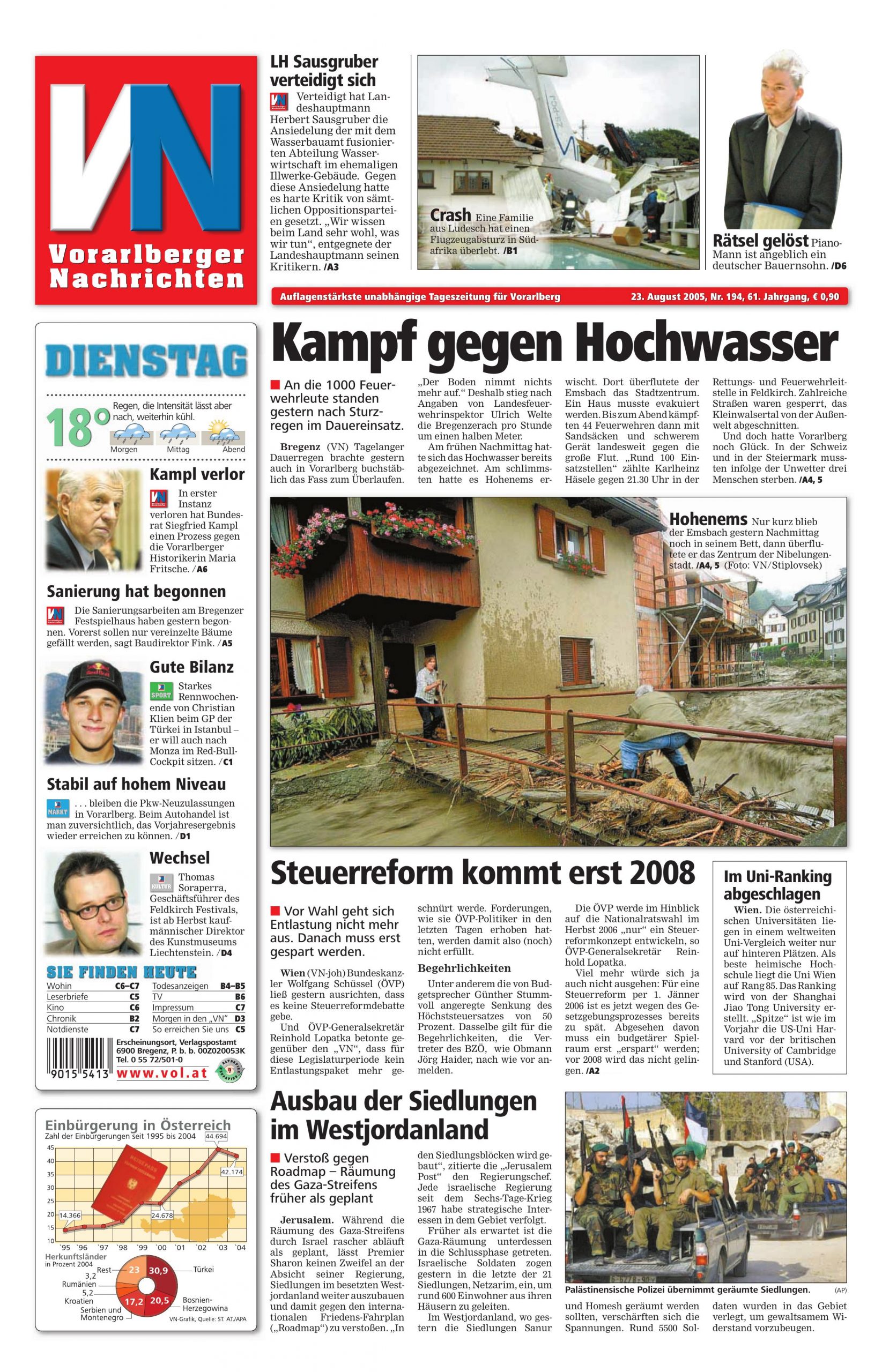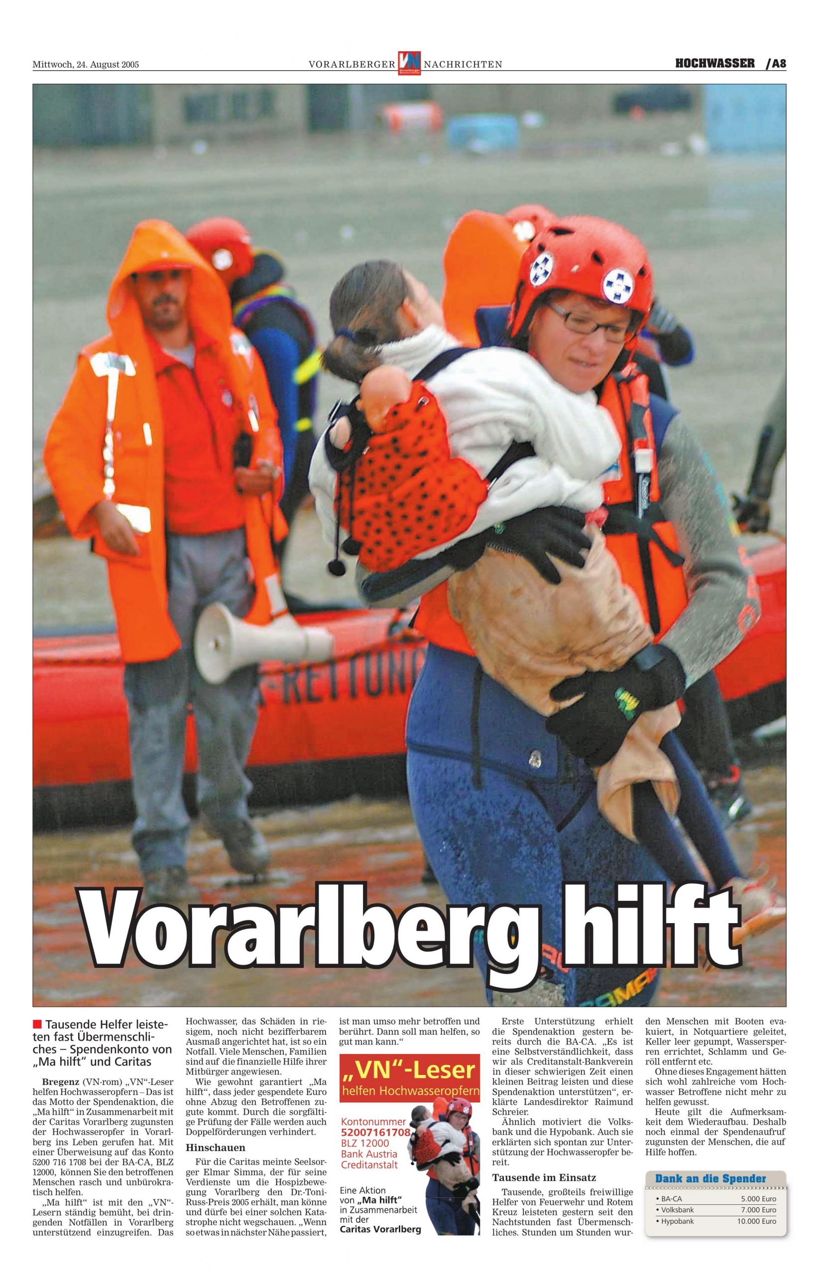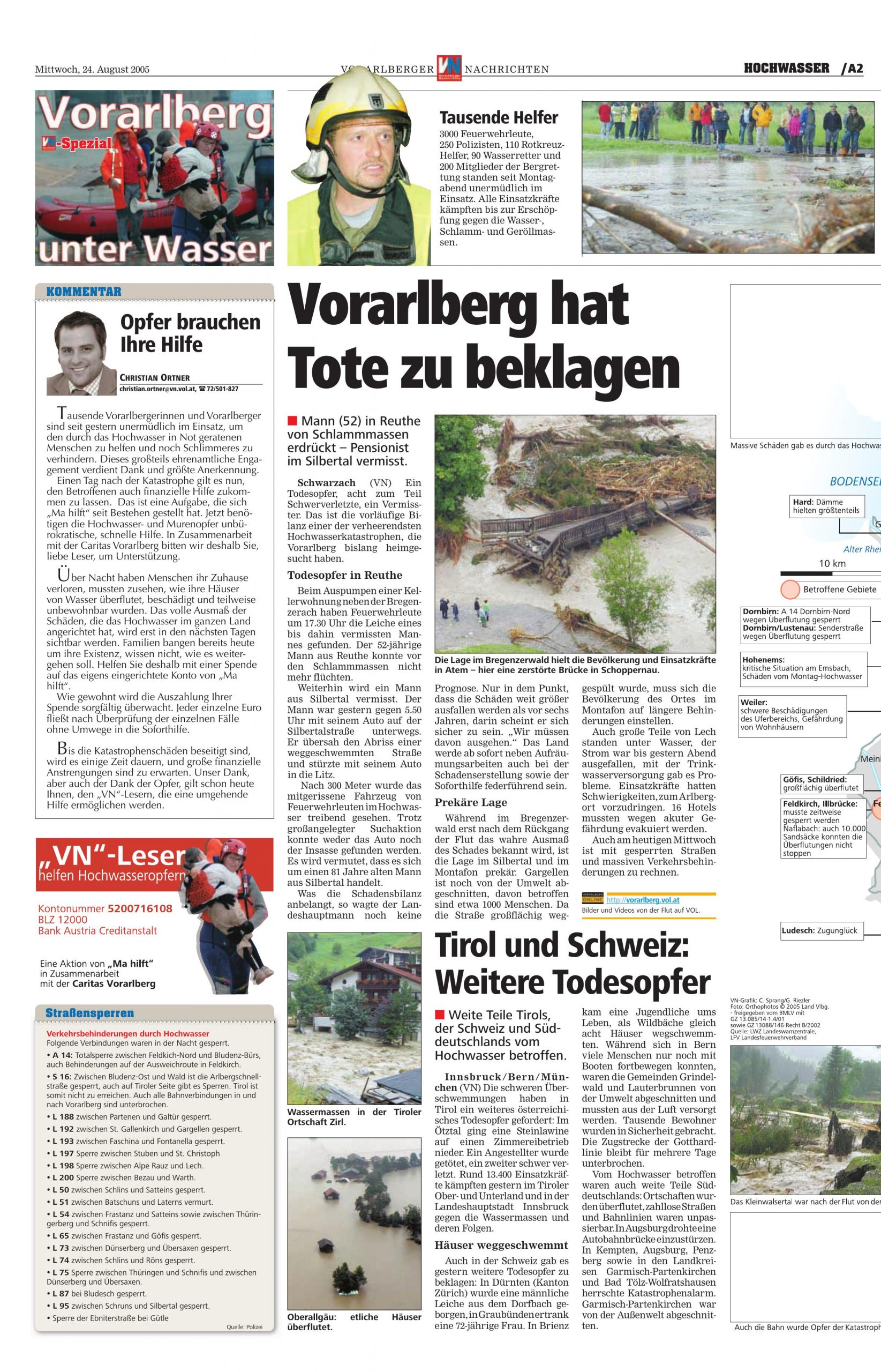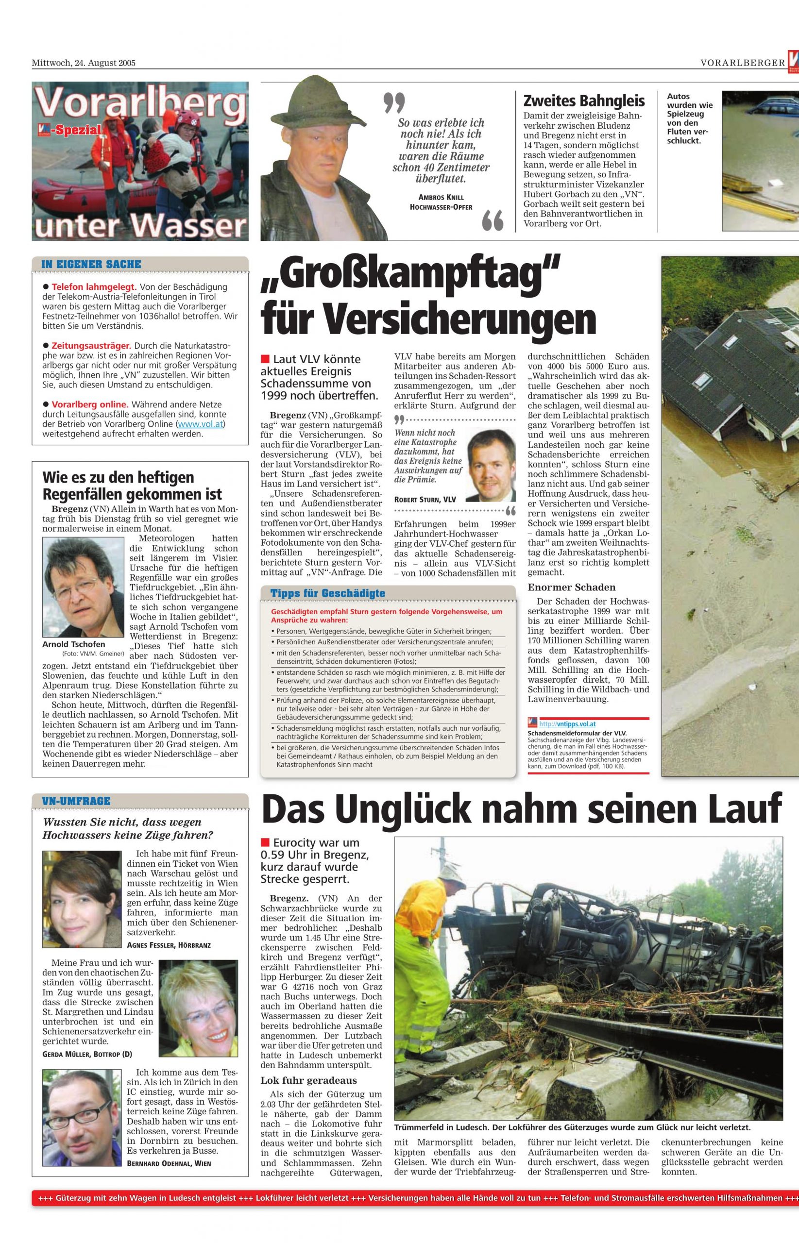 - Landeshauptmann Herbert Sausgruber spricht von einer Lage, die „wesentlich dramatischer als 1999“ gewesen sei. Mehrere Regionen sind weiterhin von der Außenwelt abgeschnitten.