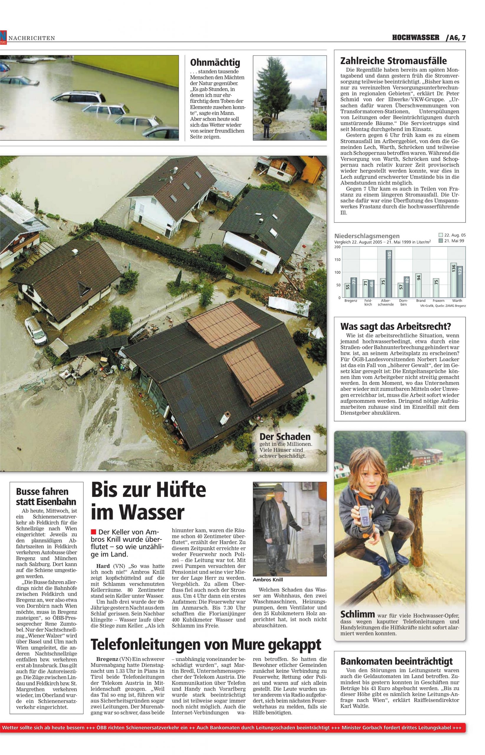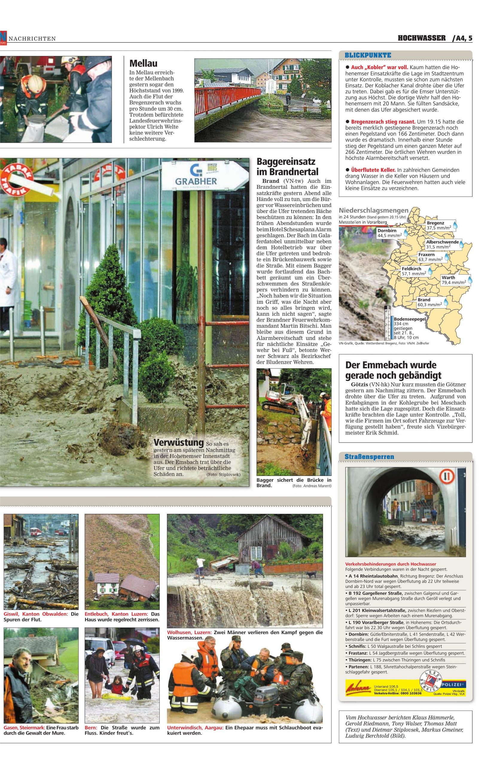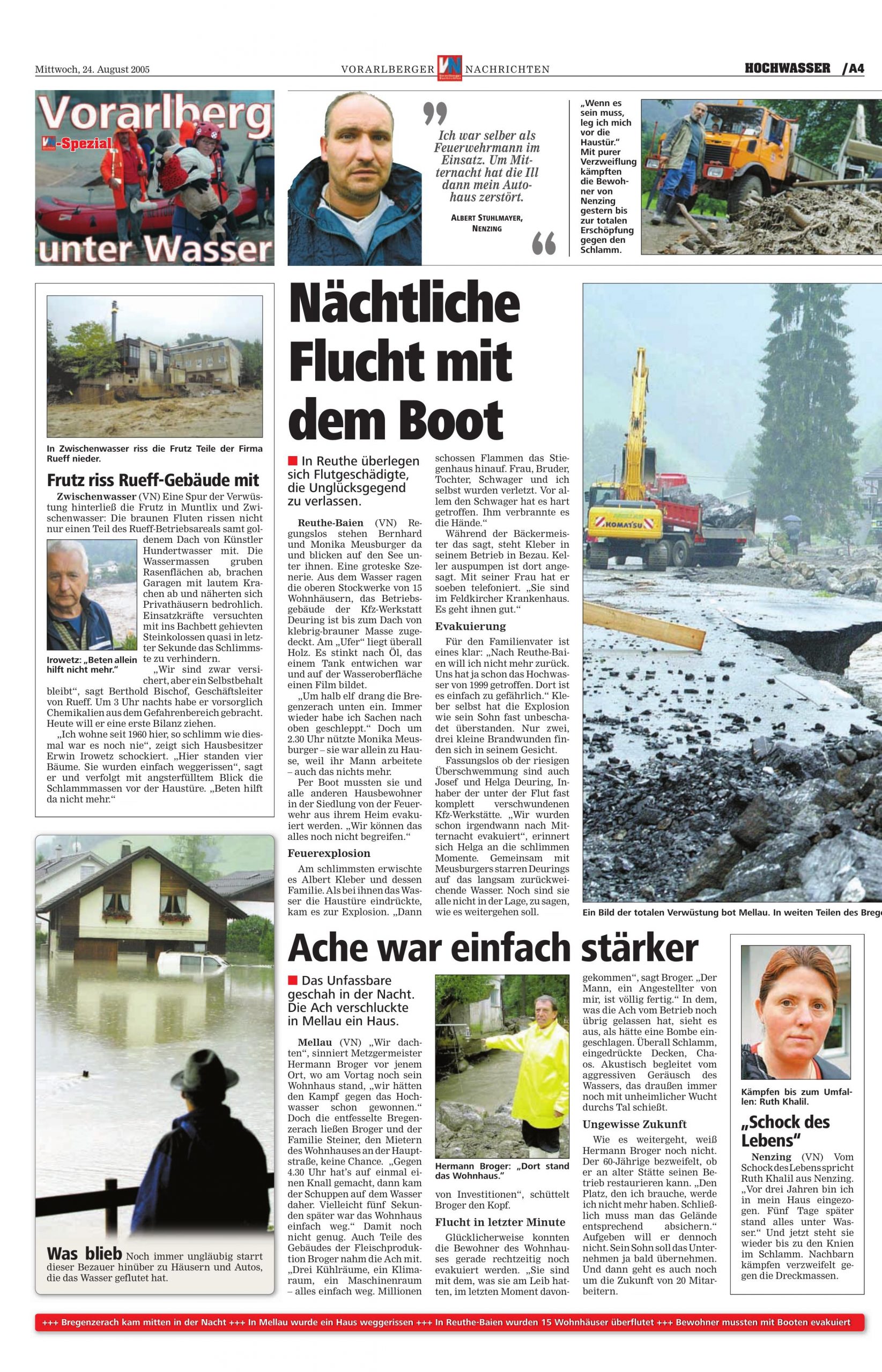 - Zwischen 03.00 und 06.00 Uhr erreichen Bregenzerach und Ill ihre Höchststände. In Mellau zerstört die Bregenzerach ein Wohnhaus vollständig.