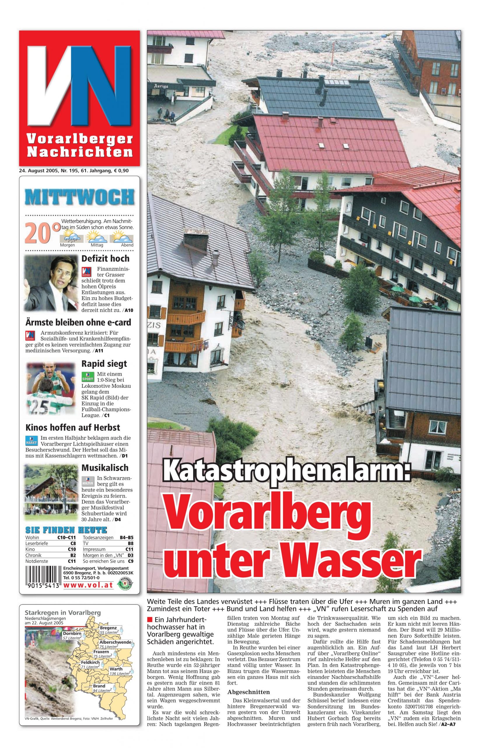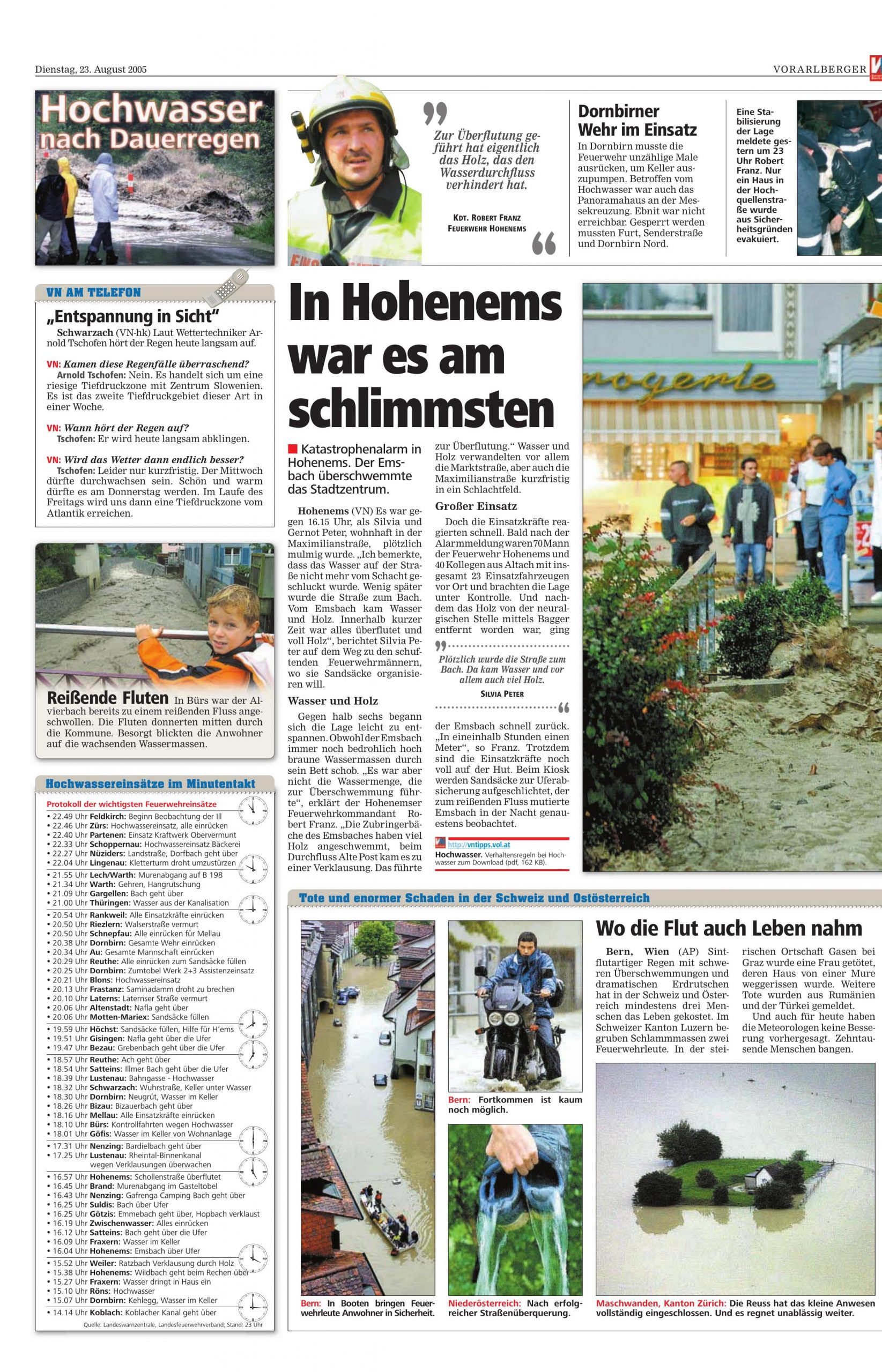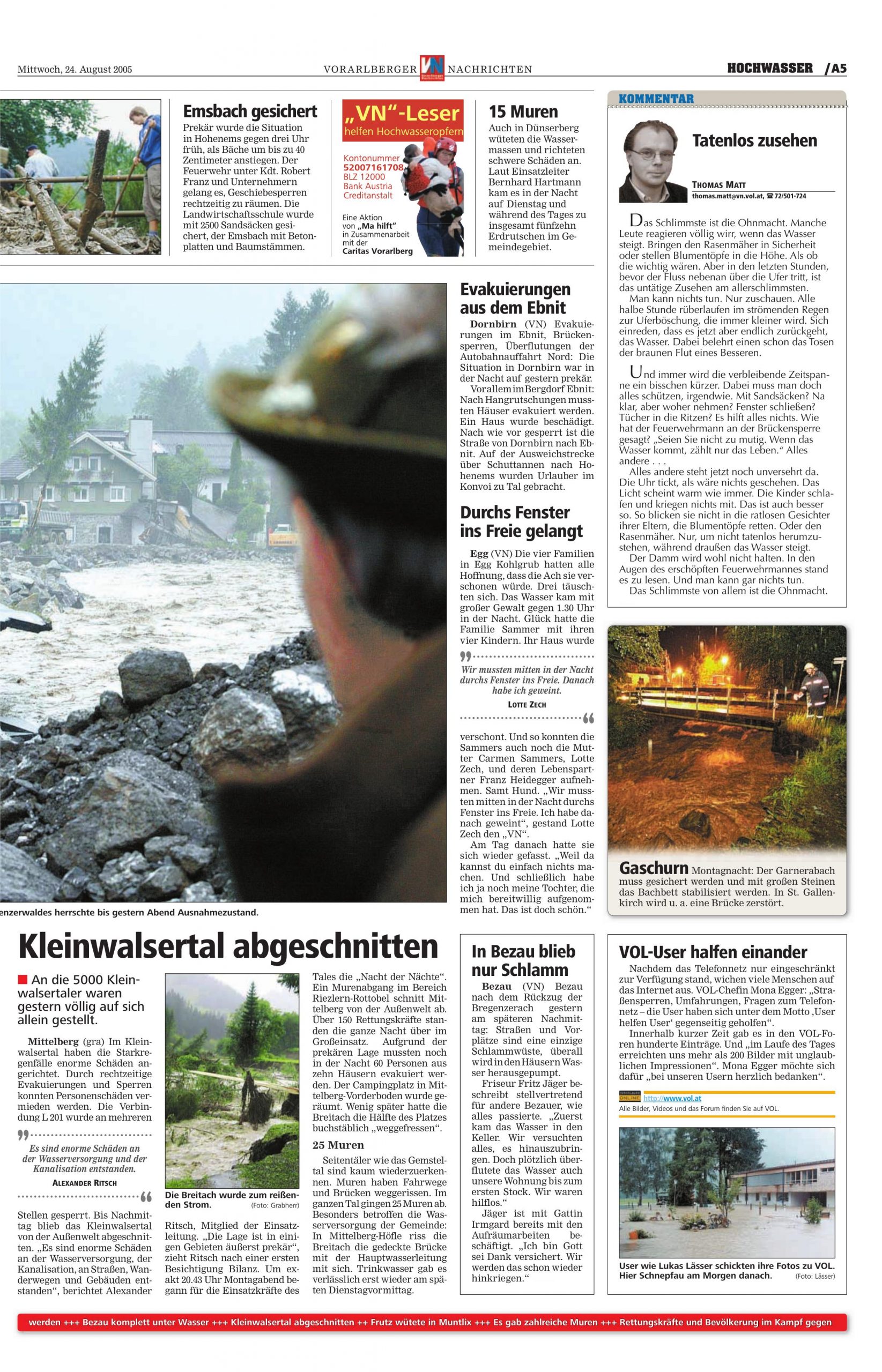 - Zwischen 03.00 und 06.00 Uhr erreichen Bregenzerach und Ill ihre Höchststände. In Mellau zerstört die Bregenzerach ein Wohnhaus vollständig.
