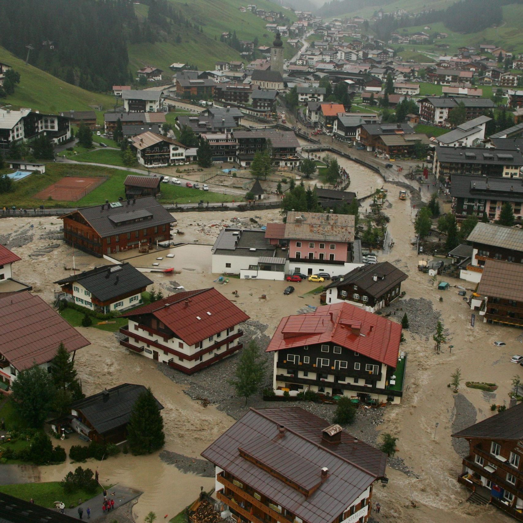 - Gegen 22.00 Uhr treten auch im Arlberggebiet und im Kleinwalsertal Bäche über die Ufer. Murenabgänge blockieren Straßen. In Riezlern fällt der Strom aus.