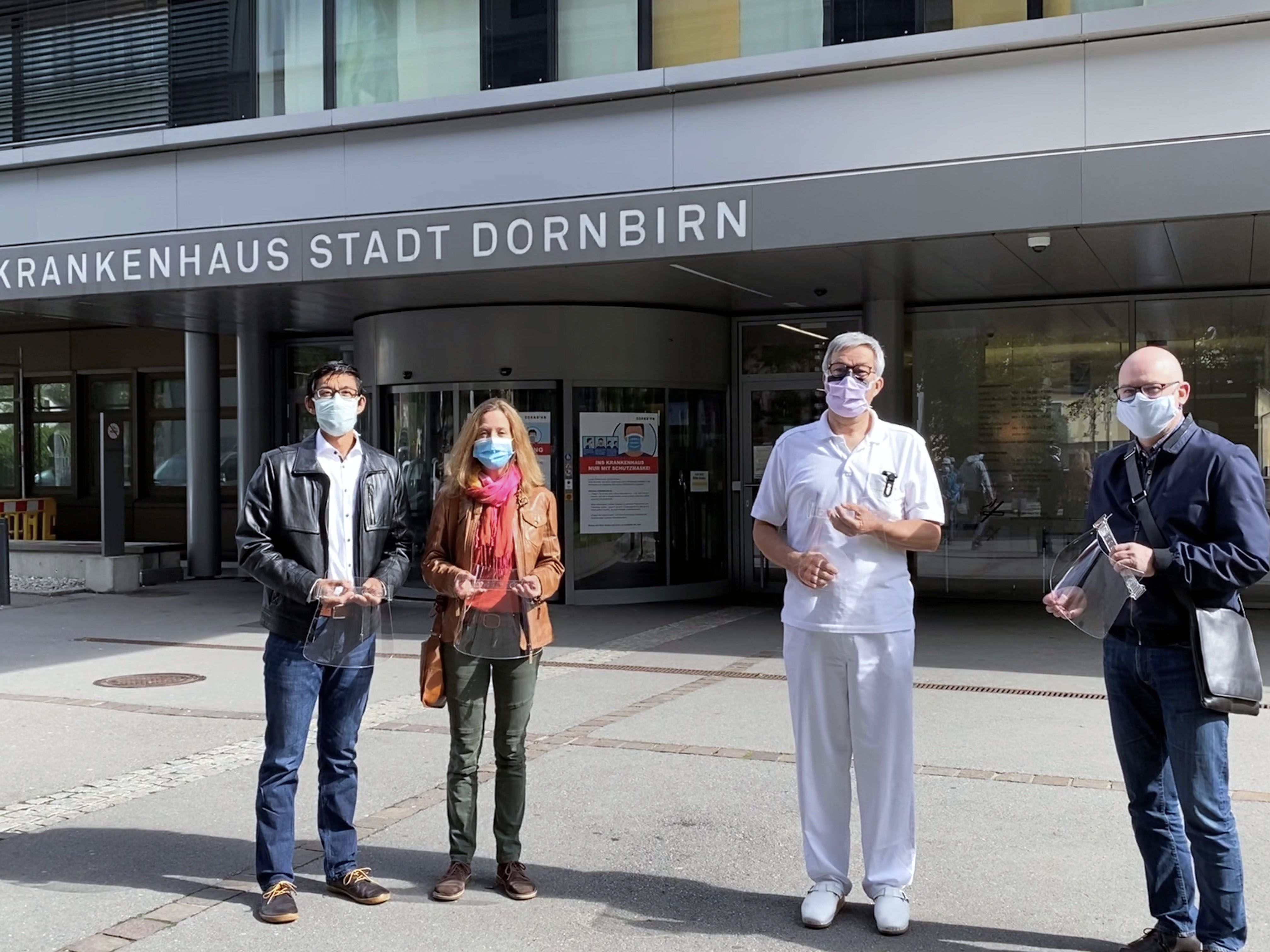 Dornbirn. Die Idee stammt aus den USA, die Konstruktion wurde von zwei Vorarlberger Betrieben weiterentwickelt und umgesetzt, das Ergebnis finden das Ärzte- sowie Pflegepersonal sehr gut: Ein additiv gefertigtes Gesichtsschild, ein sogenanntes Faceshield, desinfizierbar und somit wiederverwendbar. 200 dieser Faceshields wurden von einer privaten Initiative ans städtische Krankenhaus übergeben. „Ich möchte mich für die unbürokratische Unterstützung zum Schutz unserer Mitarbeiterinnen und Mitarbeiter bedanken. Hier wurden Ressourcen und Kreativität eingesetzt, um anderen zu helfen“, freut sich Bürgermeisterin Dipl.-Vw. Andrea Kaufmann.