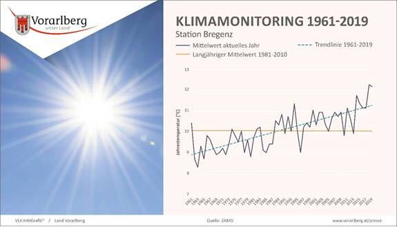 KlimatologInnen gehen davon aus, dass sich der Trend zur Erwärmung fortsetzen wird. Bis zum Ende dieses Jahrhunderts wird für Vorarlberg eine Zunahme der Jahresmitteltemperatur um 4,2 Grad Celsius erwartet, wenn nicht rechtzeitig wirksame Klimaschutzmaßnahmen ergriffen werden.