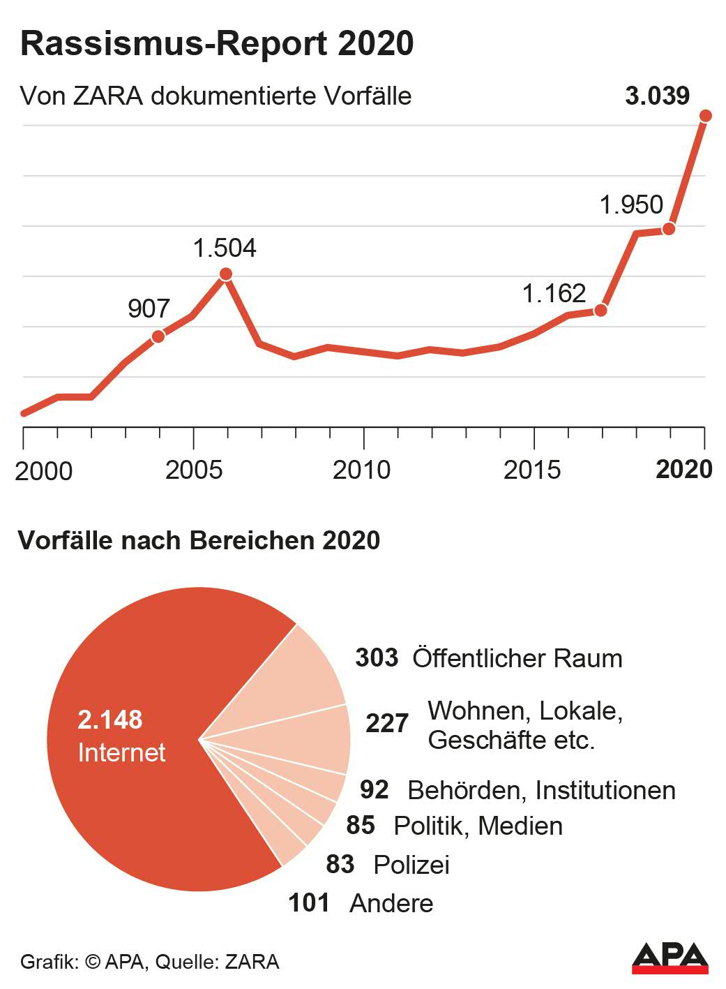 Die Anti-Rassismus-Initiative ZARA hat im Jahr 2020 einen Rekord an gemeldeten rassistischen Vorfällen verzeichnet. Insgesamt haben sich im Vorjahr 3.039 Menschen an ZARA gewandt, die Rassismus erlebt oder wahrgenommen haben. Gegenüber 2019 ist das ein Zuwachs um 1.089 Fälle. 24 Prozent der Meldungen betrafen Rassismus aufgrund der Hautfarbe. Einen starken Anteil (2.148) hatten Meldungen von Online-Rassismus, was einer Verdoppelung gegenüber 2019 entspricht.