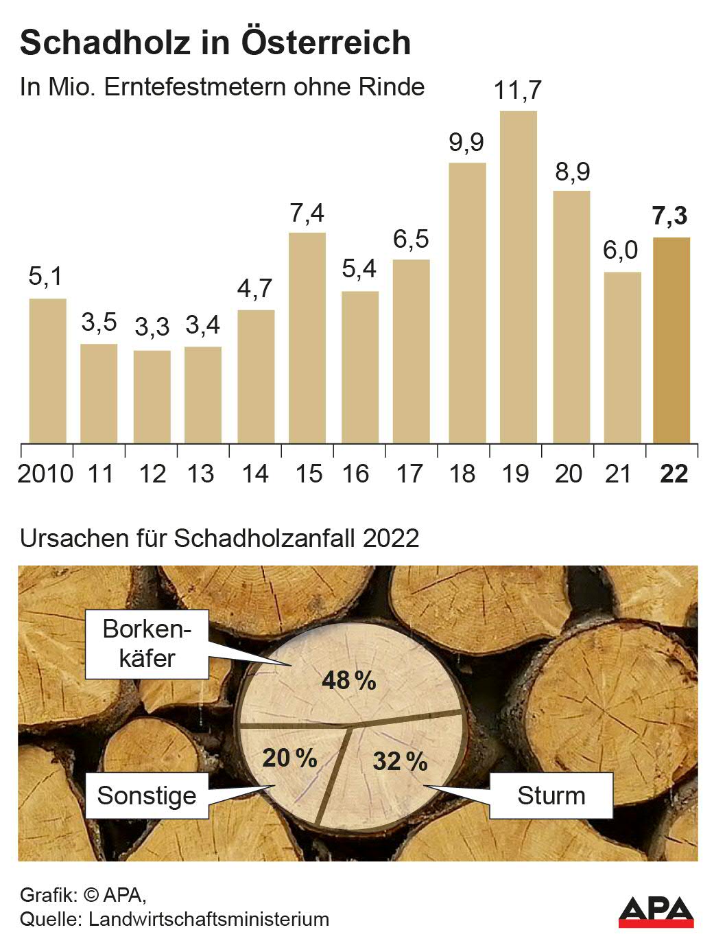 In Österreich wurde 2022 etwas mehr Holz geschlagen, als im Vorjahr. Über ein Drittel davon war Schadholz. Laut Agrarminister Norbert Totschnig (ÖVP) war die treibende Kraft für den Anstieg der Preisanstieg und nur in den Bundesländern Steiermark, Kärnten und Tirol die Schadholzmengen.