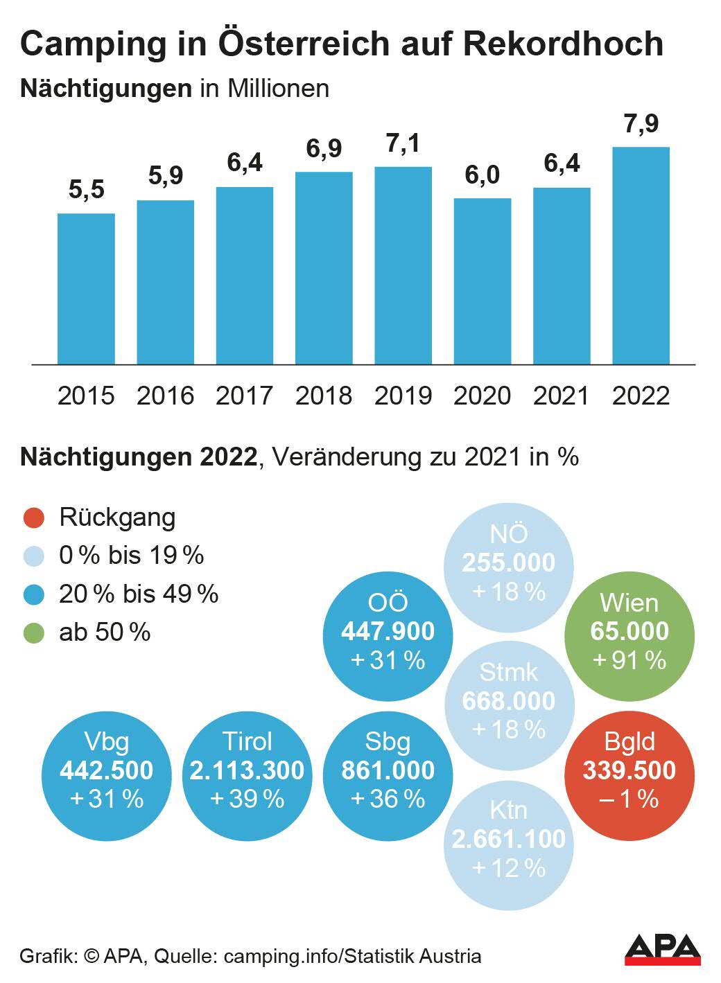 Die Zahl der Camping-Übernachtungen ist über die vergangenen Jahre stetig gestiegen - außer 2020, als die Coronakrise sogar dort ihre Spuren hinterließ. Wurden 2019 noch fast 7,15 Millionen Nächte gecampt, waren es im Jahr darauf nur mehr 6 Millionen Nächte (minus 16 Prozent). 2021 gab es zwar wieder ein Plus. 6,38 Millionen Übernachtungen entsprachen aber noch nicht einmal ganz dem 2017er-Wert (6,4 Mio. Nächtigungen). Erst voriges Jahr wurde der Vorkrisenwert von 2019 wieder überschritten - dafür aber gleich ordentlich.