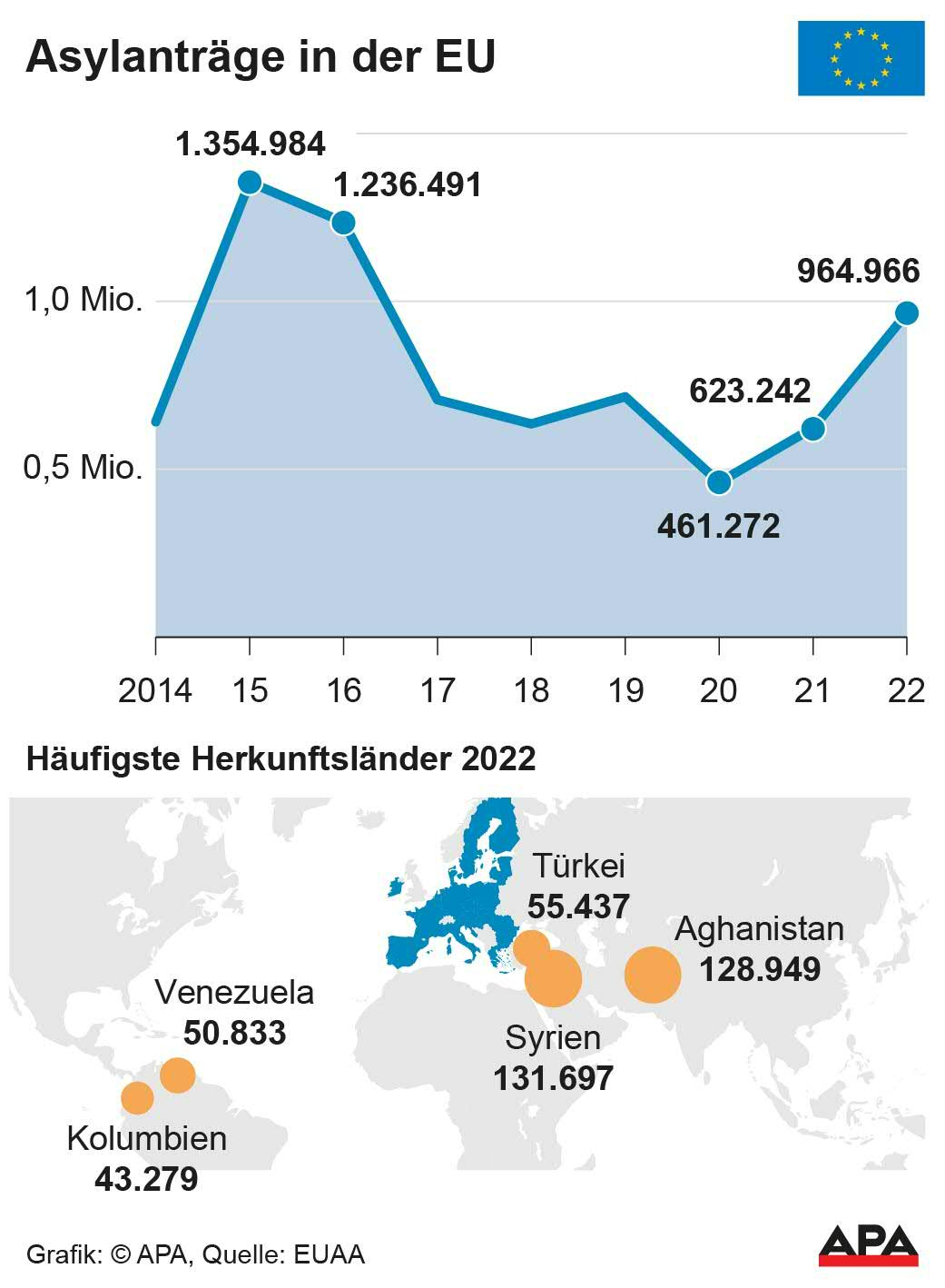 Nach Angaben der EU-Asylagentur (EUAA) vom Mittwoch stellten in den 27 EU-Staaten sowie in der Schweiz und Norwegen insgesamt 966.000 Schutzsuchende einen Antrag auf Asyl - das sind um 50 Prozent mehr als 2021. Seit 2008 wurden höhere Zahlen nur in den Jahren 2015 und 2016 verzeichnet, als es deutlich mehr als eine Million Anträge gab.
