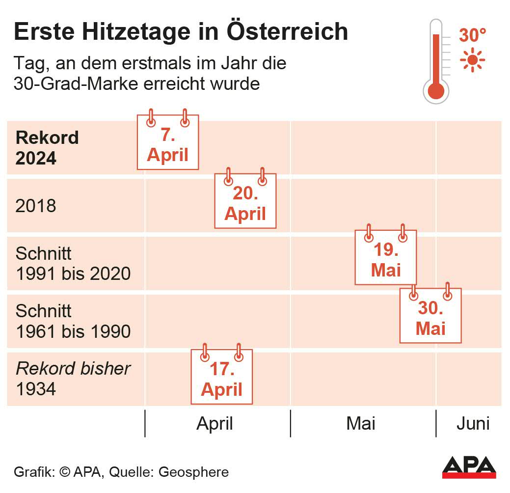 Das Wochenende brachte außergewöhnlich hohe Temperaturen. Es war um etwa zehn bis 15 Grad wärmer als an durchschnittlichen ersten Apriltagen, erläuterte Geosphere Austria. In der jüngeren Vergangenheit der Klimaperiode 1991 bis 2020 wurde in Österreich der erste "30er" im Durchschnitt am 19. Mai erreicht, wobei die typische Schwankungsbreite von Anfang Mai bis Anfang Juni reichte. In der Klimaperiode 1961 bis 1990 wurde die 30-Grad-Marke im Durchschnitt erst am 30. Mai geknackt, mit einer Schwankung von Mitte Mai bis Mitte Juni.