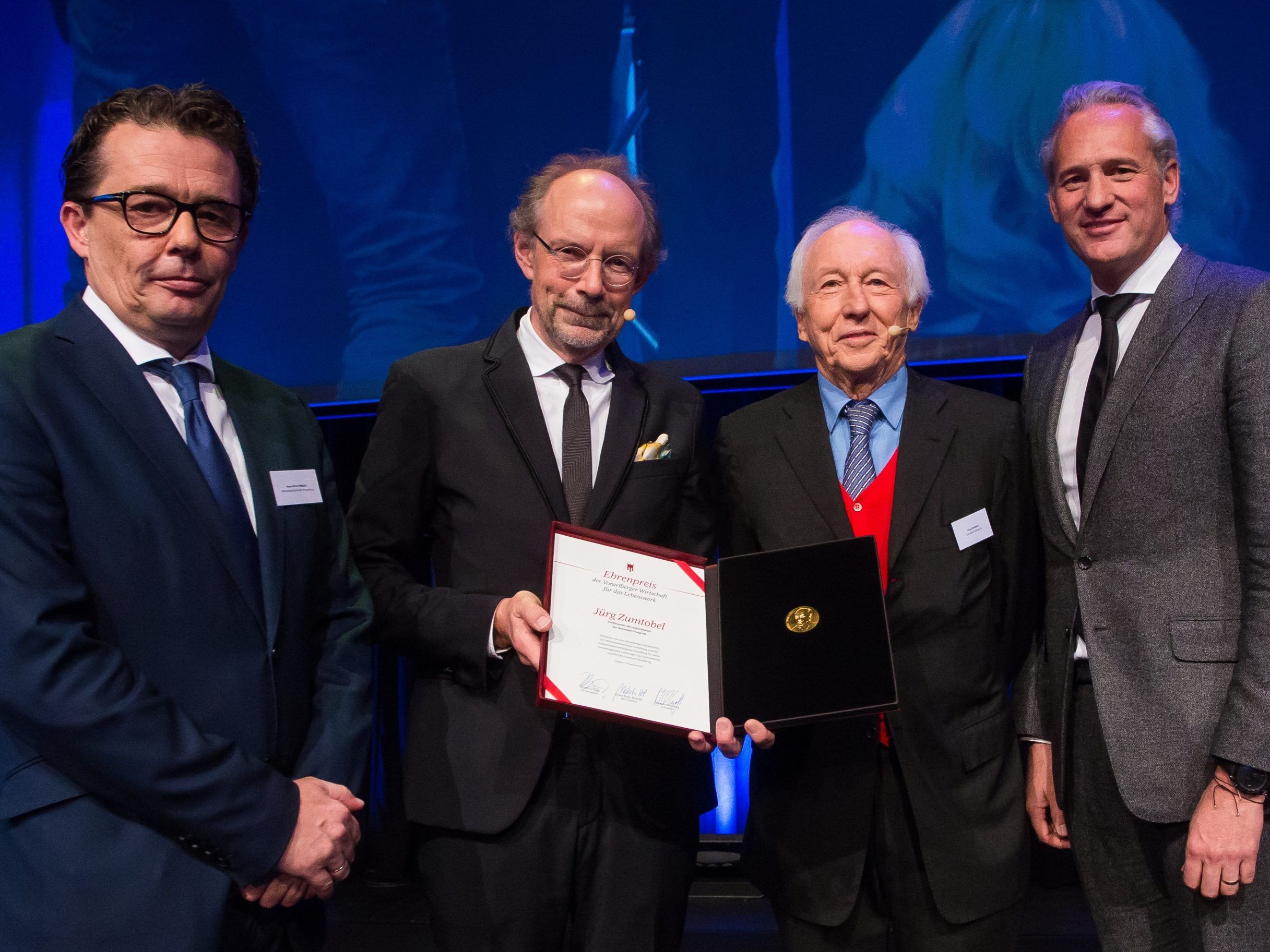 Die Industriellenvereinigung Vorarlberg, die Wirtschaftskammer Vorarlberg und die Vorarlberger Nachrichten haben den „Ehrenpreis der Vorarlberger Wirtschaft für das unternehmerische Lebenswerk“ an den Aufsichtsratsvorsitzenden, Hauptaktionär und langjährigen Geschäftsführer des Dornbirner Hightechunternehmens Zumtobel Group, Jürg Zumtobel überreicht.