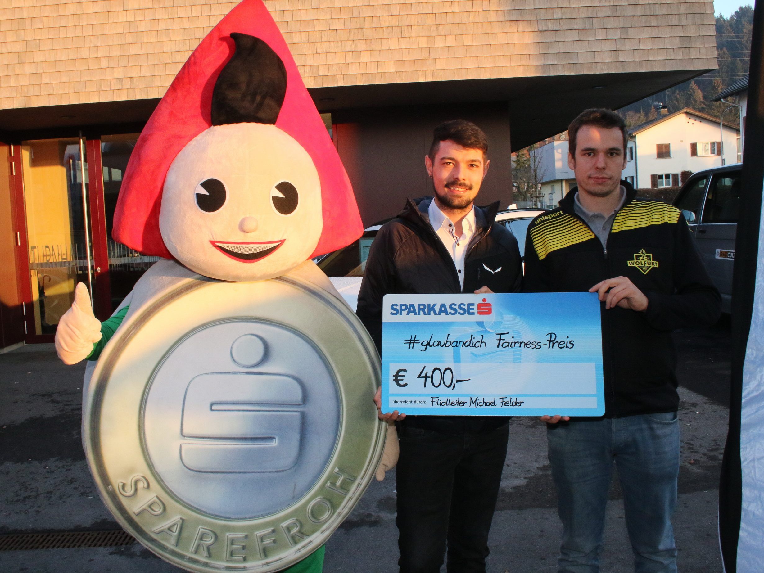 Sparkasse Wolfurt Filialleiter Michael Felder machte den Ankick und überreichte FC Wolfurt Obmann Stefan Muxel einen Scheck in Höhe von 400 Euro für das fairste Team des Turnieres.