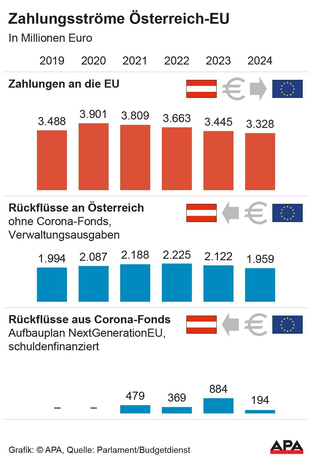 Dem österreichischen Bruttobeitrag nach Brüssel standen 2024 Rückflüsse nach Österreich in Höhe von 1,959 Mrd. Euro gegenüber, wie aus der Beantwortung weiters hervorgeht. Für 2025 bzw. 2026 werden auch höhere Rückflüsse in den Bundeshaushalt erwartet, nämlich 3,914 Mrd. bzw. 2,103 Mrd. Euro. Diese Zahlen enthalten nicht alle Rückflüsse, da nicht alle EU-Programme über den Bundeshaushalt abgewickelt, sondern zum Teil auch direkt von der EU-Kommission bezahlt werden. Da Österreich aufgrund seiner hohen Wirtschaftsleistung mehr ins EU-Budget einzahlt als es an Rückflüssen bekommt, ist es seit dem EU-Beitritt Nettozahler in der Union.