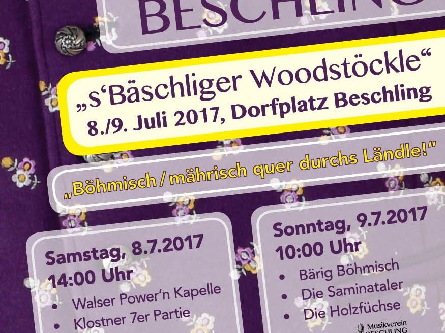 Mit einem Dörflefest wie in alten Zeiten, nur eben ein wenig moderner aufgemacht, möchten wir Musikanten vom Musikverein Beschling unser heuriges Jubiläum feiern. Unter dem Motto „Böhmisch/mährisch quer durch’s Ländle!“ gastieren an unserem Festwochenende 8 Musikformationen aus allen Landesteilen bei uns am wunderschönen Beschlinger Dorfplatz.
