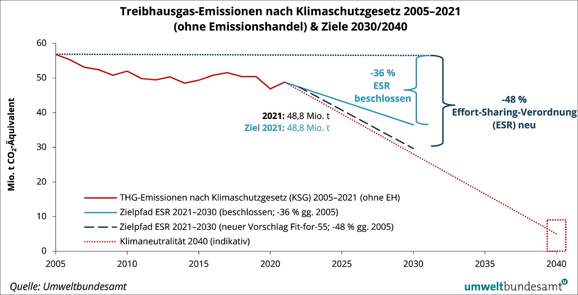 Der abnehmende Trend der letzten Jahre in der Abfallwirtschaft mit einem Minus von 0,8 Prozent bzw. 0,02 Millionen Tonnen CO2-Äquivalent, und bei den F-Gasen (fluorierte Gase, Anm.), mit einem Rückgang von 13,9 Prozent bzw. 0,3 Millionen Tonnen CO2-Äquivalent, setzte sich auch für 2021 fort. Bei den Wirtschaftssektoren, die nicht dem Europäischen Emissionshandel unterliegen, ist laut Umweltbundesamt im Jahr 2021 mit Emissionen in der Höhe von 48,4 Millionen Tonnen CO2-Äquivalent das geltende österreichische Klima-Ziel gemäß dem Zielpfad zur Erreichung der EU Effort-Sharing-Verordnung erreicht.