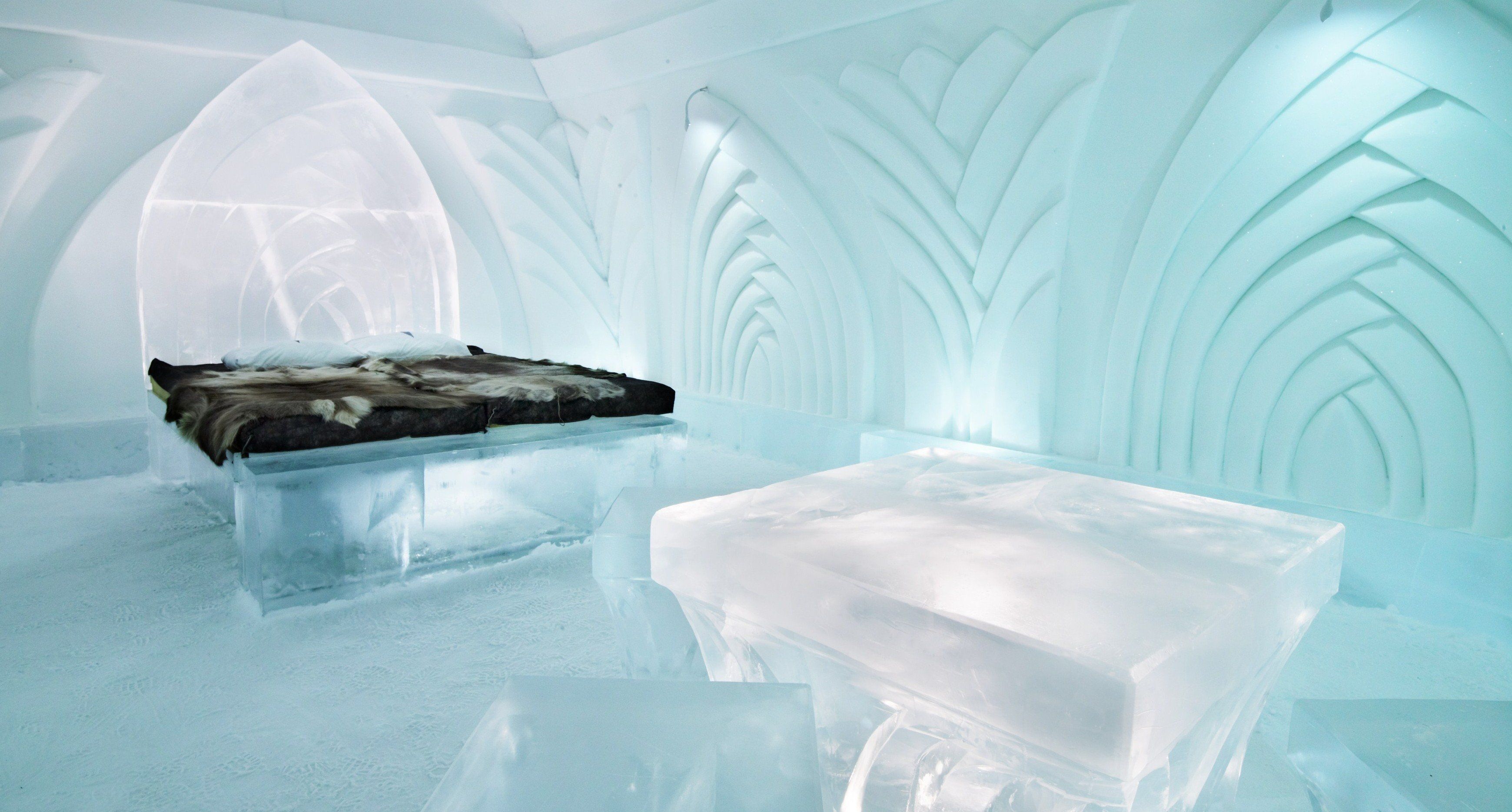 Im nordschwedischen Jukkasjärvi, 200 Kilometer vom Polarkreis entfernt, steht das kunstvoll errichtete Icehotel. Es gilt als weltweit erstes und größtes Schnee-Hotel und wird jedes Jahr aufs Neue aus dem Fluss des schwedischen Lapplands dem „Torne älv“ hergestellt. Gäste wählen zwischen Kunst-, Eis-, Schnee-, oder Nordlichtzimmern und nehmen an Schlittentouren oder Eis-Schnitzereien teil. Morgens werden die Besucher liebevoll mit einem heißen Preiselbeersaft geweckt.
