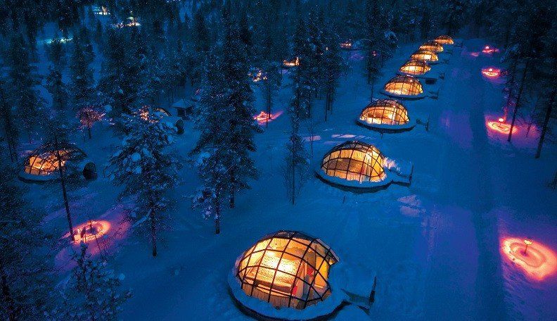 In dem finnischen Dörfchen Saariselkä blicken Gäste des Igloo Village Kakslauttanen direkt vom Bett aus auf den klaren Sternenhimmel. Die unterirdischen Schnee-Iglus verfügen über Thermo-Glas-Decken, sodass Besucher einen einmaligen Ausblick auf die Nordlichter Finnlands genießen. Auf Rücksicht der Privatsphäre, sind alle 40 Iglus weit auseinanderstehend gebaut. Zum Aufwärmen bietet das Hotel seinen Gästen unter anderem Husky- und Rentier-Safaris an.