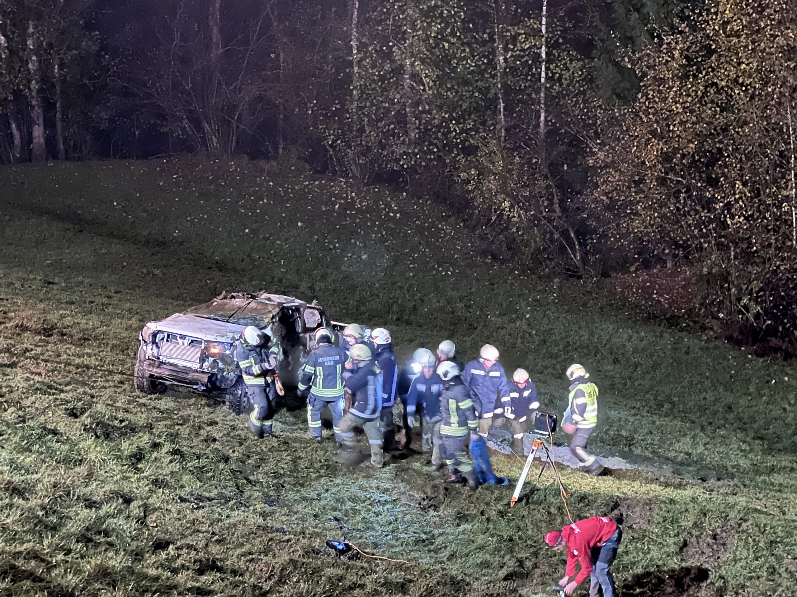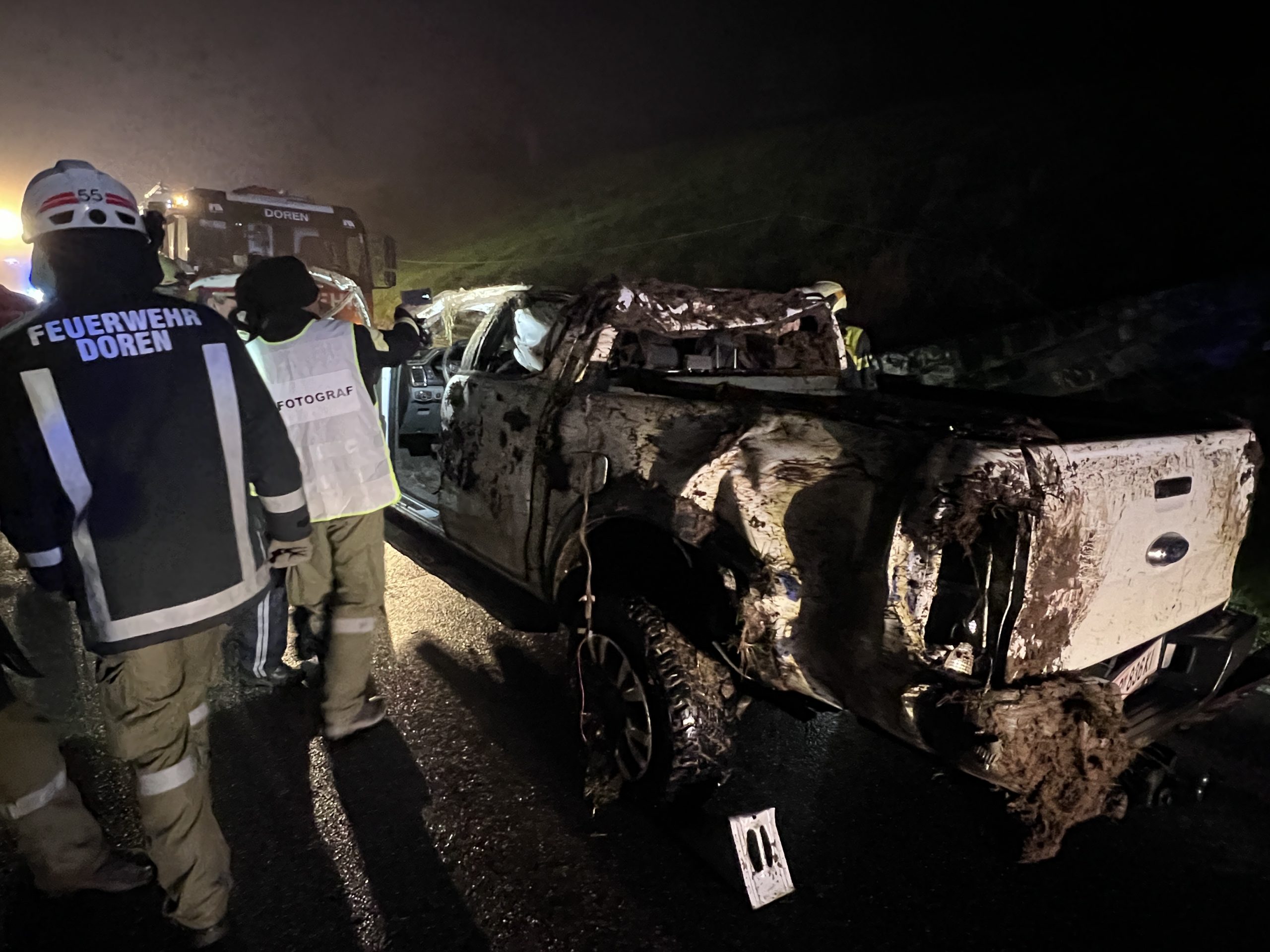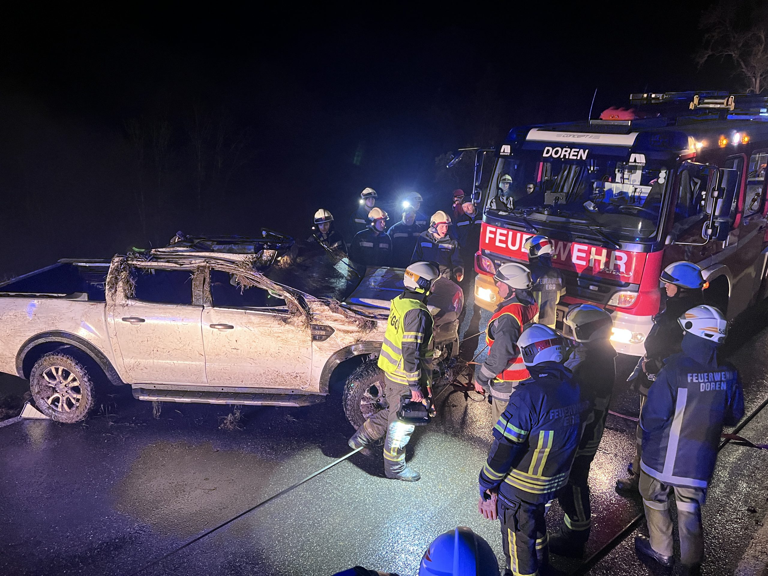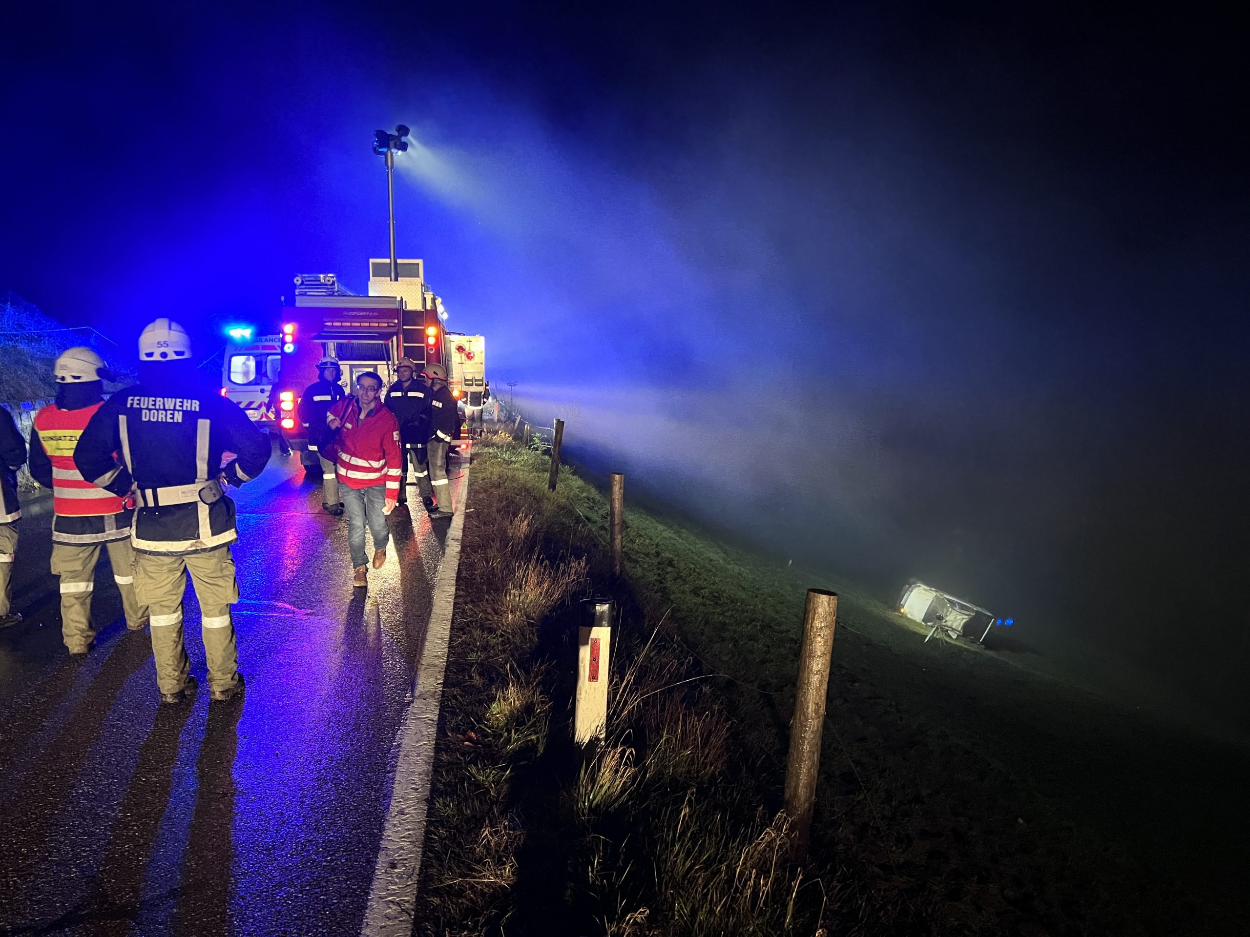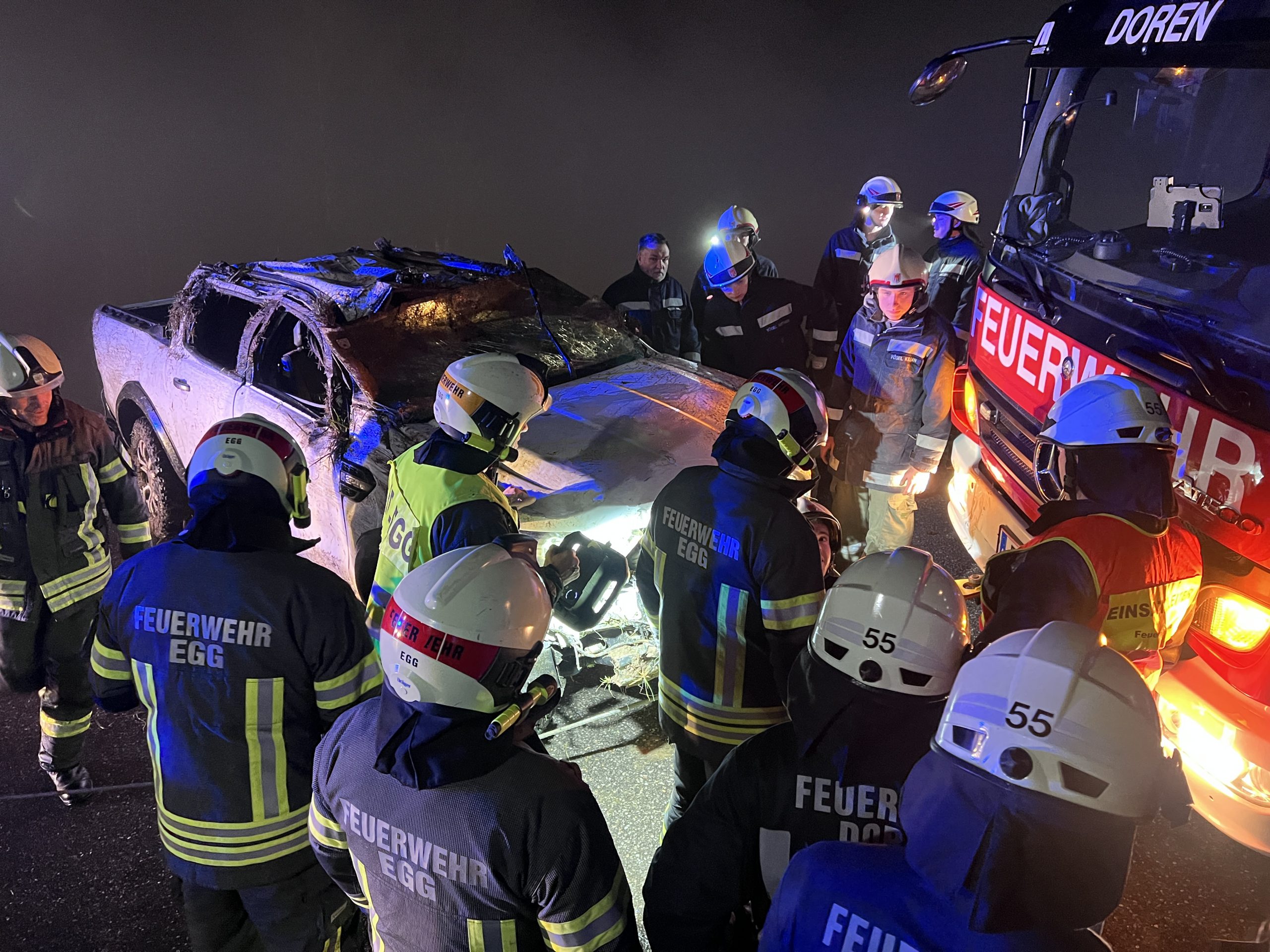 Das Fahrzeug erlitt einen Totalschaden und wurde von den Feuerwehren Doren und Egg geborgen. An der Unfallstelle waren umfangreiche Rettungsmaßnahmen erforderlich. Neben einem Rettungsfahrzeug und einem Notarztwagen waren auch 30 Feuerwehrleute der Freiwilligen Feuerwehren Doren und Egg sowie zwei Polizeikräfte der Polizeiinspektion Hittisau im Einsatz.