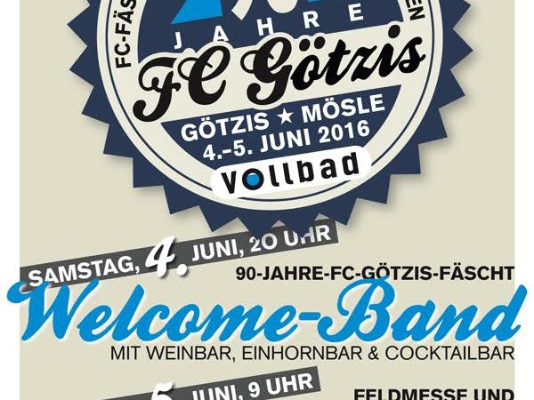 Samstag 04. Juni 2016 ab 20.00 Uhr – 90-Jahre-FC-Götzis-Fäscht mit “Welcome Band Live”, Weinbar der Weinagentur West, Einhorn- und Cocktailbar. (Eintritt € 7,- / Vorverkauf bei Vereinsmitgliedern der 1MS, 1b und AH)