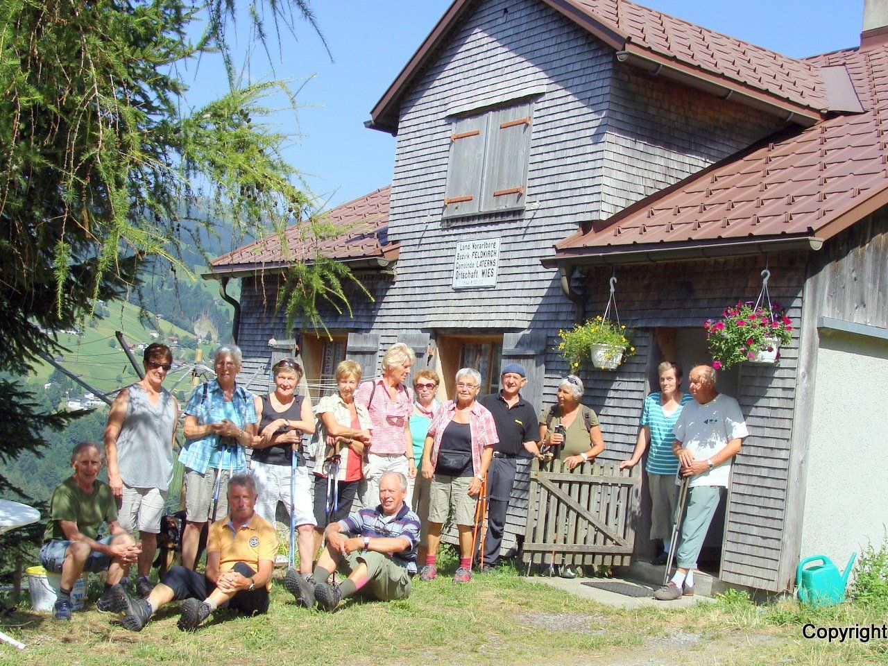 Wir wählten den unteren Wanderweg vorbei am Quellgebiet und erreichten ohne viel Mühe die Alpe Wies. Hier konnten wir in der kühlen Stube ein Trinkpause einlegen. Wir alle waren erstaunt, dass in der Parzelle Laterns-Wies bis in die 20er-Jahre des letzten Jahrhunderts noch elf Häuser mit neun Familien bewohnt waren. Dann jedoch begann die Entsiedlung und auch die Schule wurde aufgelassen. Bevor wir den Rückweg antraten, besuchten wir die sehr schöne Kapelle und sangen noch ein paar Lieder. Dann ging es auf dem Fahrweg wieder zurück zum Ausgangspunkt. Die abschließende Einkehr machten wir im Gasthaus Frödisch in Muntlix.