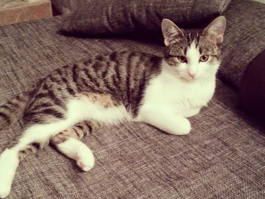Sie ist grau getiegert, hat einen weißen Bauch und einen weißen Oberkörper, alle Pfoten sind weiß, bei der rechten Vorderpfote ist die obere Hälfte auch grau getiegert, die linke Vorderpfote ist komplett weiß. Über der Nase Richtung Stirn hat sie ein weißes Dreieck und hinten links bei der Hüfte einen weißen Fleck im grauen Fell.