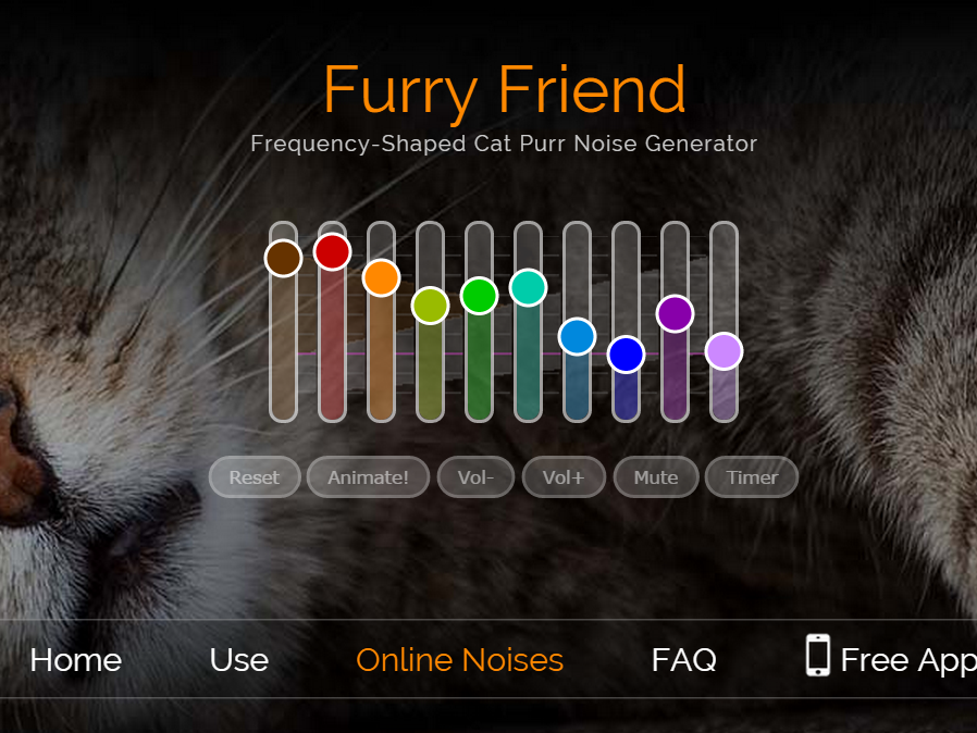 Wissenschaftliche Studien beweisen, dass Katzenbesitzer einen niedrigeren Blutdruck haben und länger leben als Menschen ohne Haustier. Zurückzuführen ist das auf das beruhigend wirkende Katzenschnurren, welches im Frequenzbereich zwischen 40 und 200 Hertz stattfindet und auch in der Geräuschtherapie ihren Einsatz findet. Mit diversen Reglern kann auf Mynoise.net am Sound geschraubt werden, bis man sein Lieblingsschnurren gefunden hat.