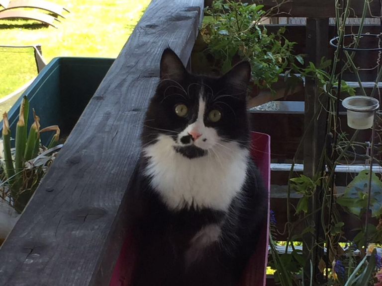 Beschreibung: männlich, kastriert. Schwarz weißes, etwas längeres Fell, vor allem hat er einen sehr bauschigen Schwanz. Alle 4 Pfoten sind Weiß und auch im Gesicht hat er eine sehr markante Zeichnung (siehe Bild).