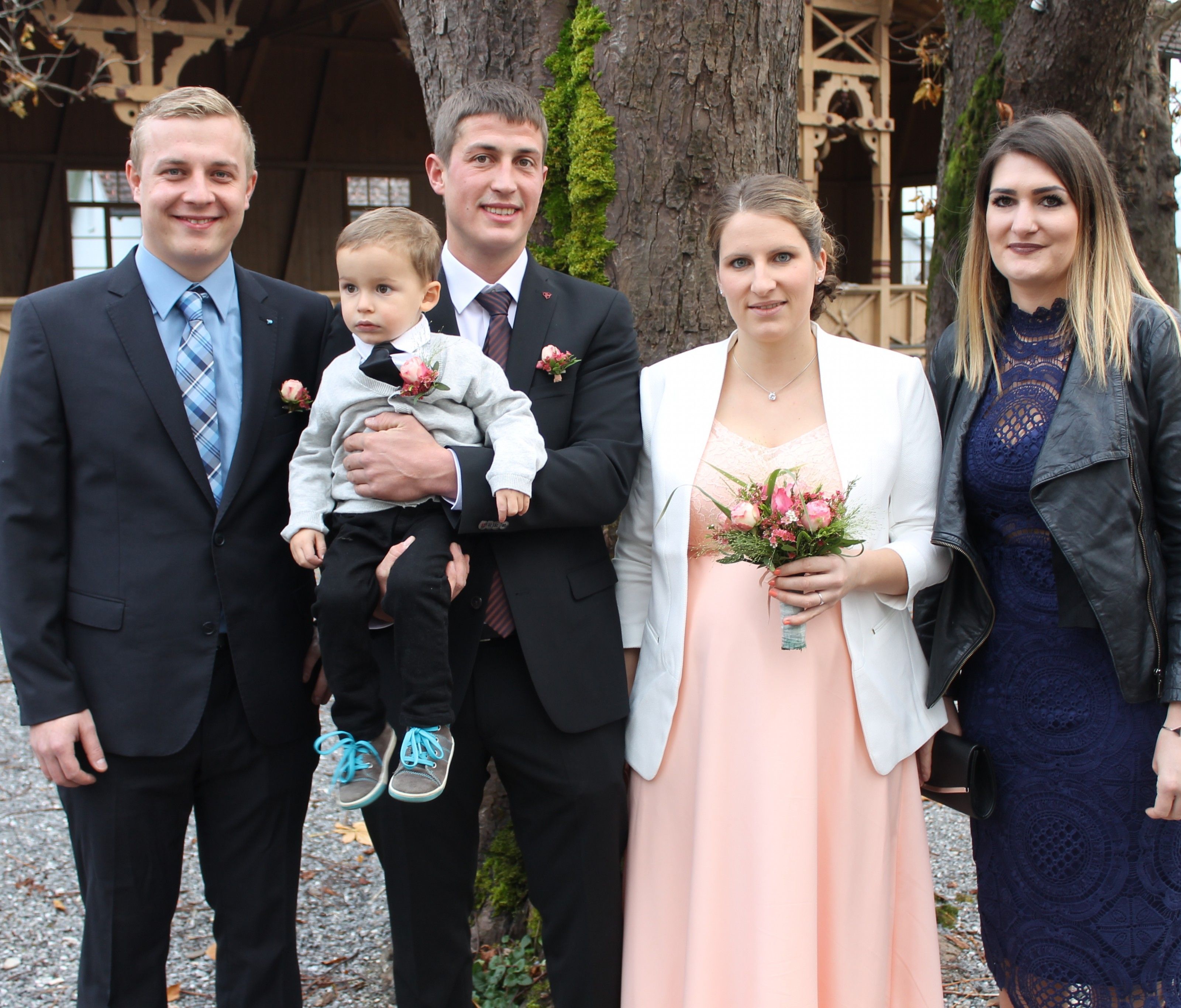 Die Friseurin und Masseurin, die sich derzeit in Karenz befindet, und der Maurerpolier wählten als Trauzeugen Madeleine Amann und Daniel Berchtel. Nach der Hochzeit stellten sich die frisch-Vermählten, den herzlichsten Gratulationswünschen der Hochzeitsgäste. Vorerst gratulierten die Mutter der Braut Berta Walter und die Eltern des Bräutigams Elisabeth und Robert Berchtel und wünschten ihren Kindern alles Glück der Welt.