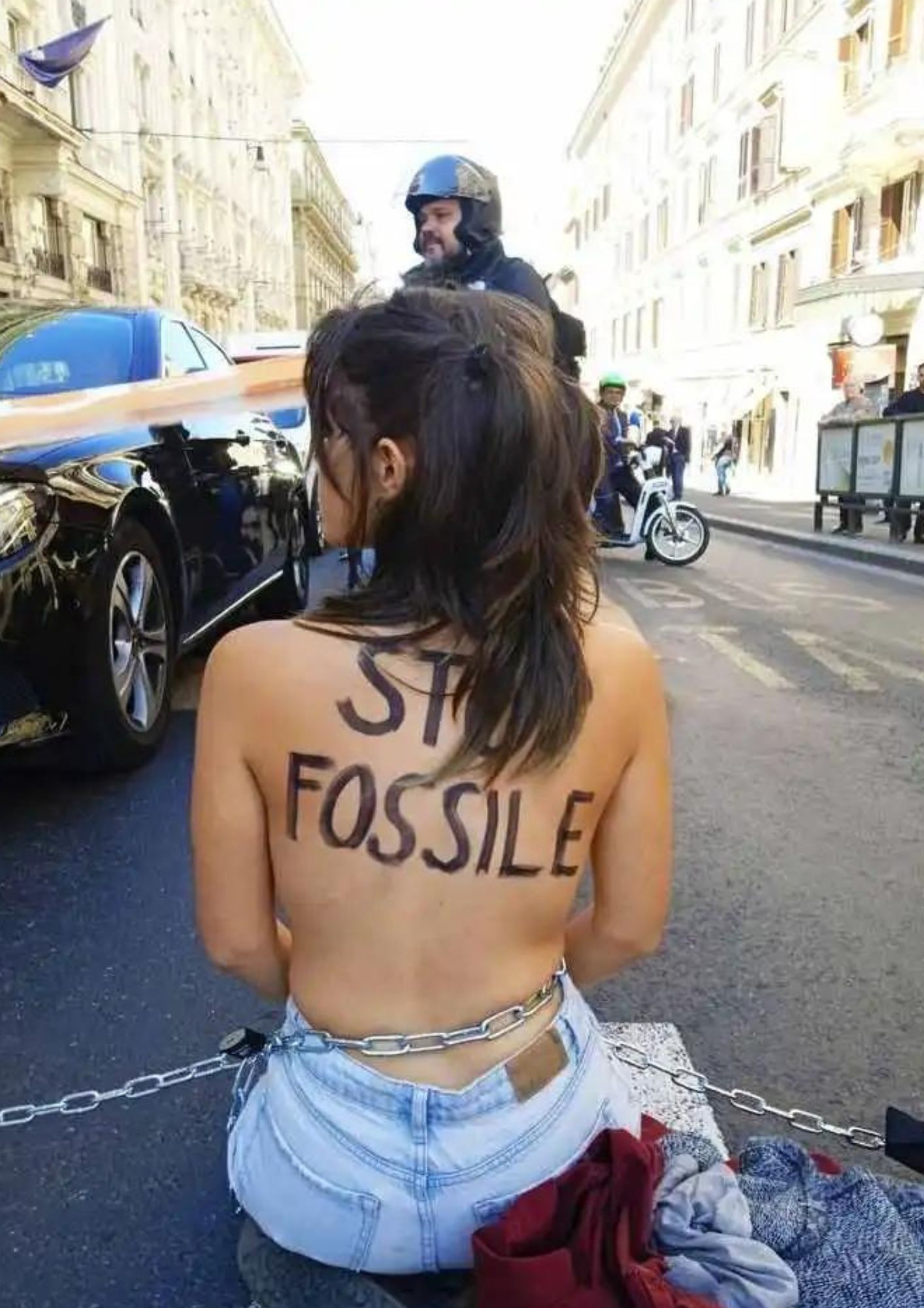 Die Demonstration fand auf der Via del Tritone statt, wo etwa ein Dutzend Menschen sich teilweise oder ganz entkleideten. Anstatt sich festzukleben, ketteten sich die Aktivisten und Aktivistinnen auf der Fahrbahn an. Die Polizei griff schnell ein und entfernte die Protestierenden innerhalb weniger Minuten.