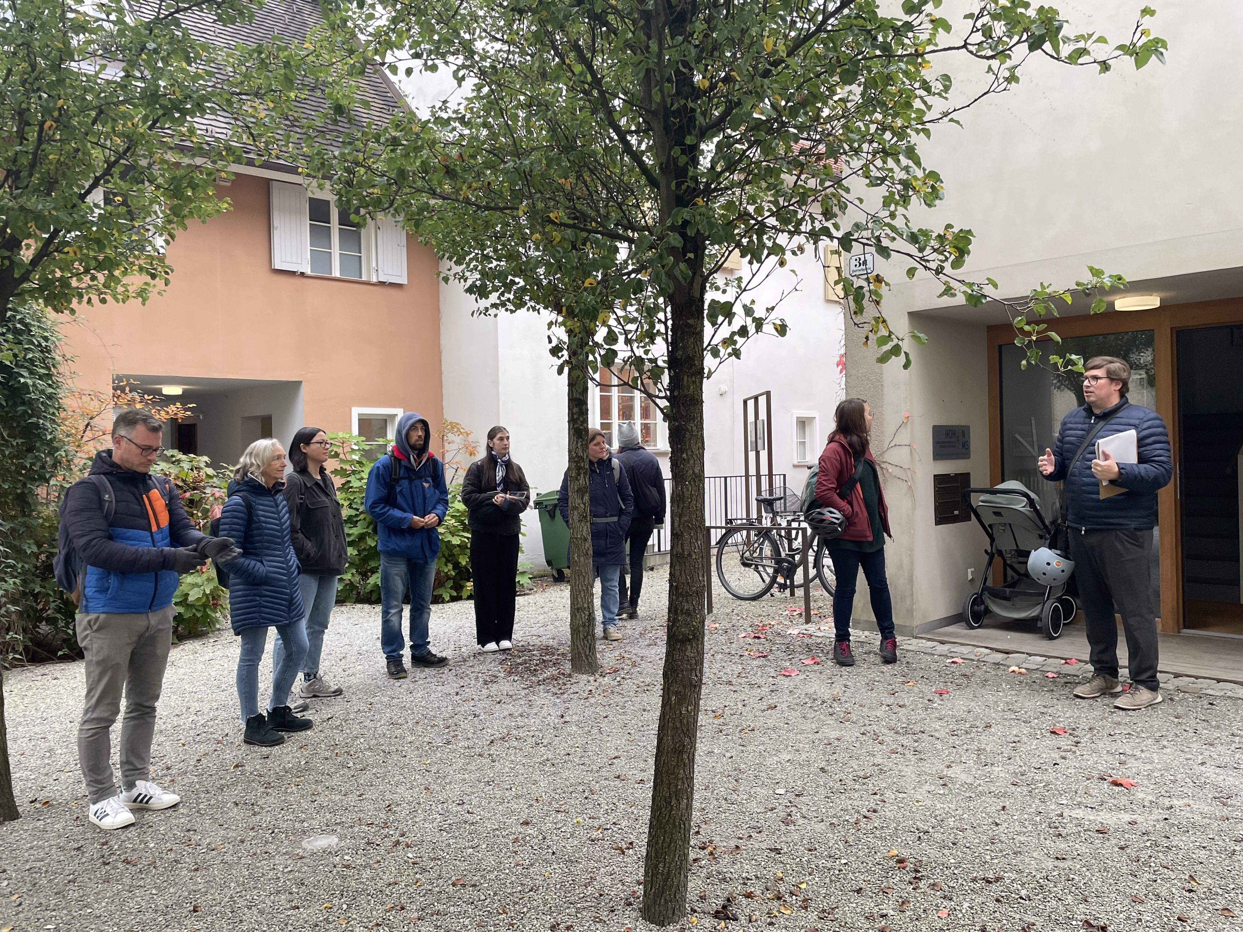 Zwei Teile der Exkursion fanden in Hohenems statt. Ein Programmpunkt war das neue RathausQuartier in Hohenems, das mit einem sechsgeschossigen Holzbau aus regionalem Fichtenholz, wiederverwendbaren Bauteilen sowie naturnaher Außenraumgestaltung als Modell für zirkuläres Bauen dient.