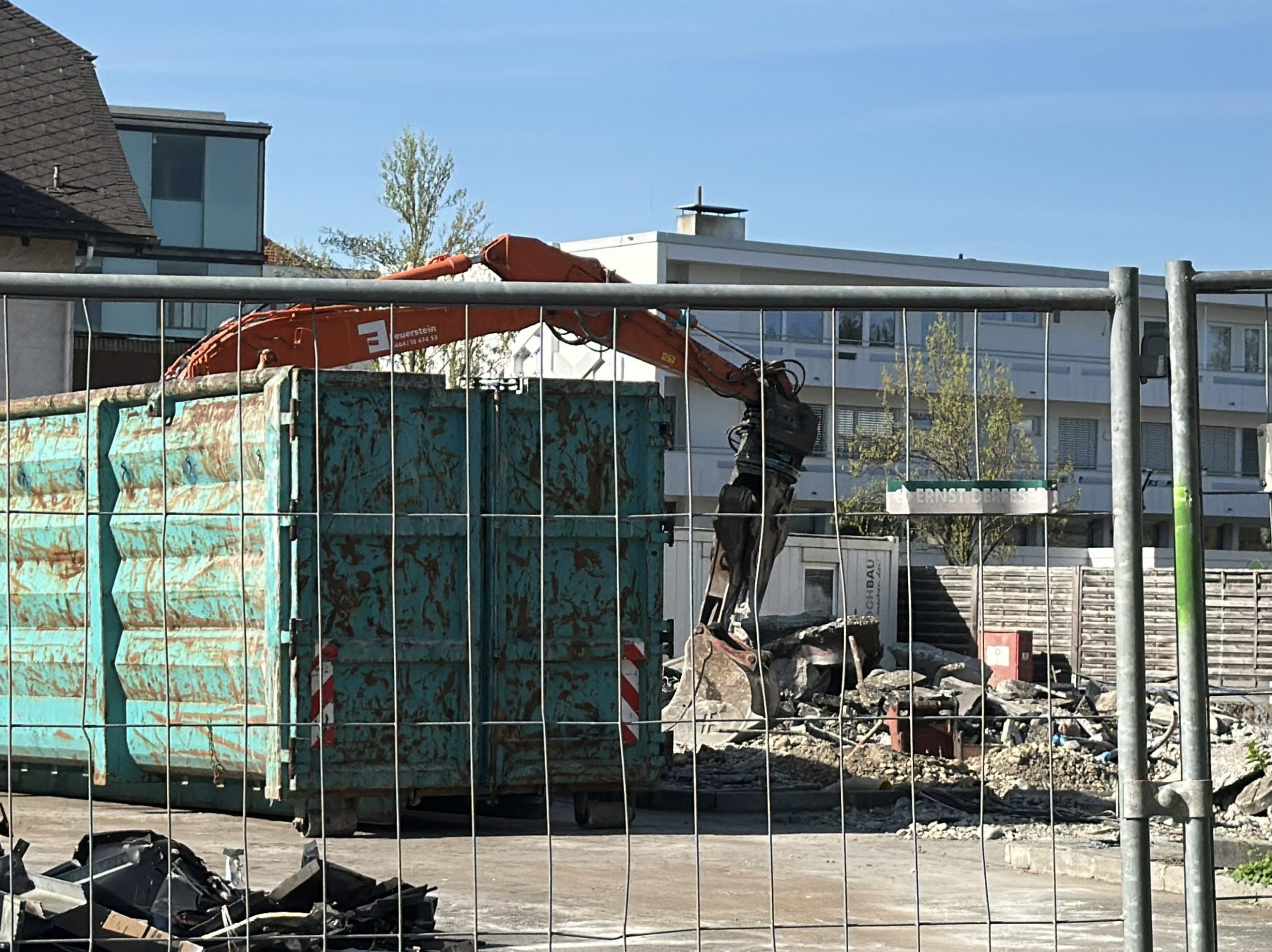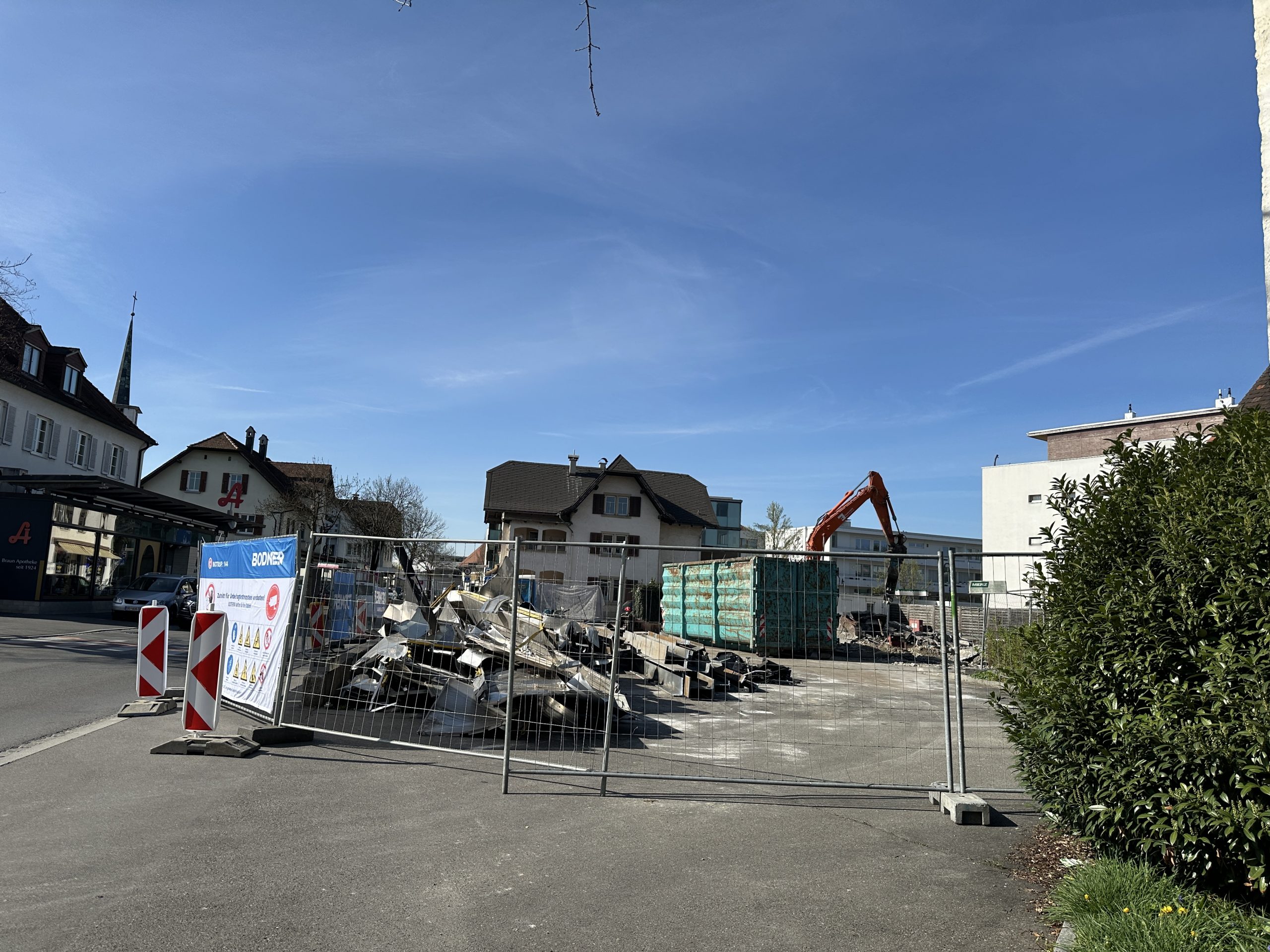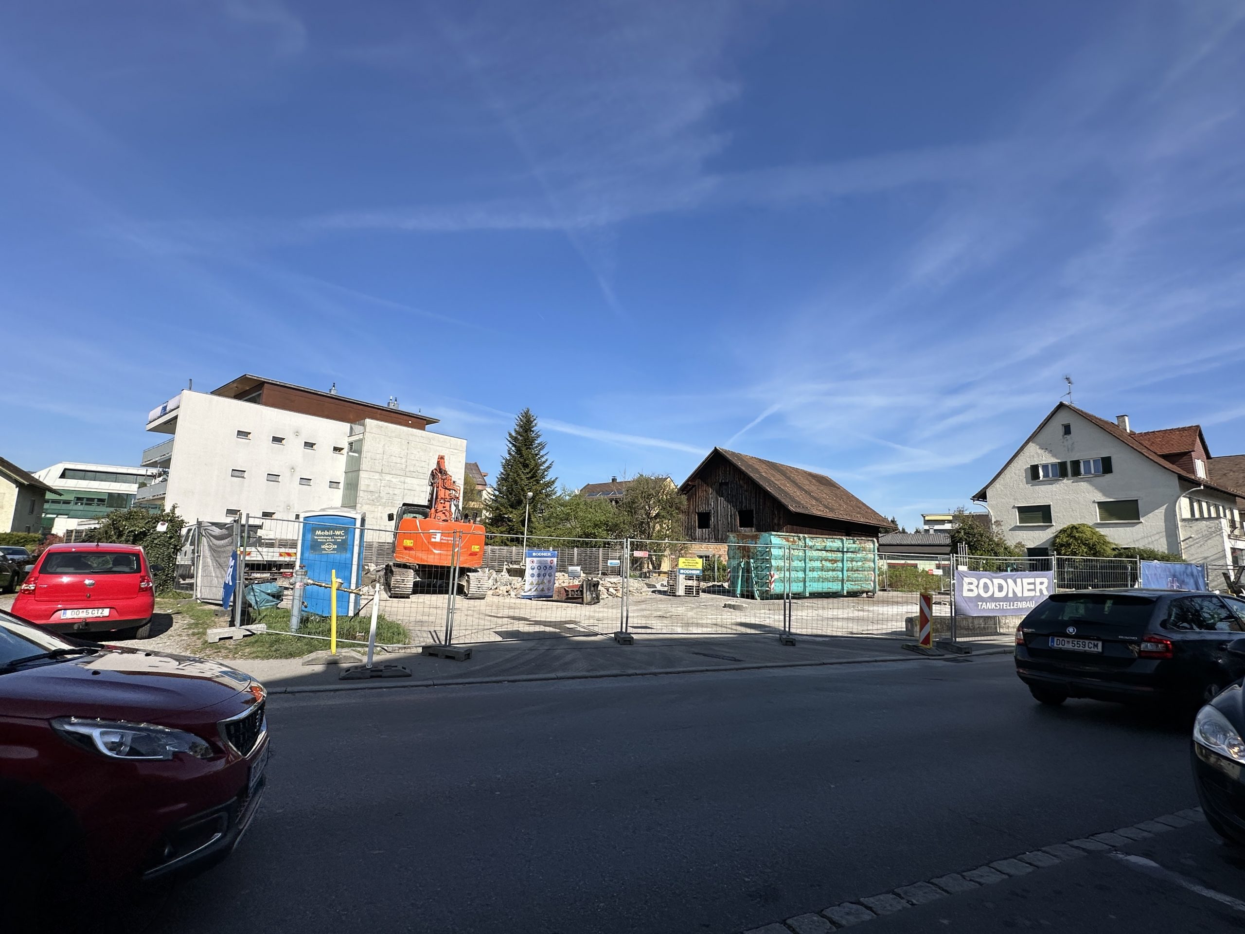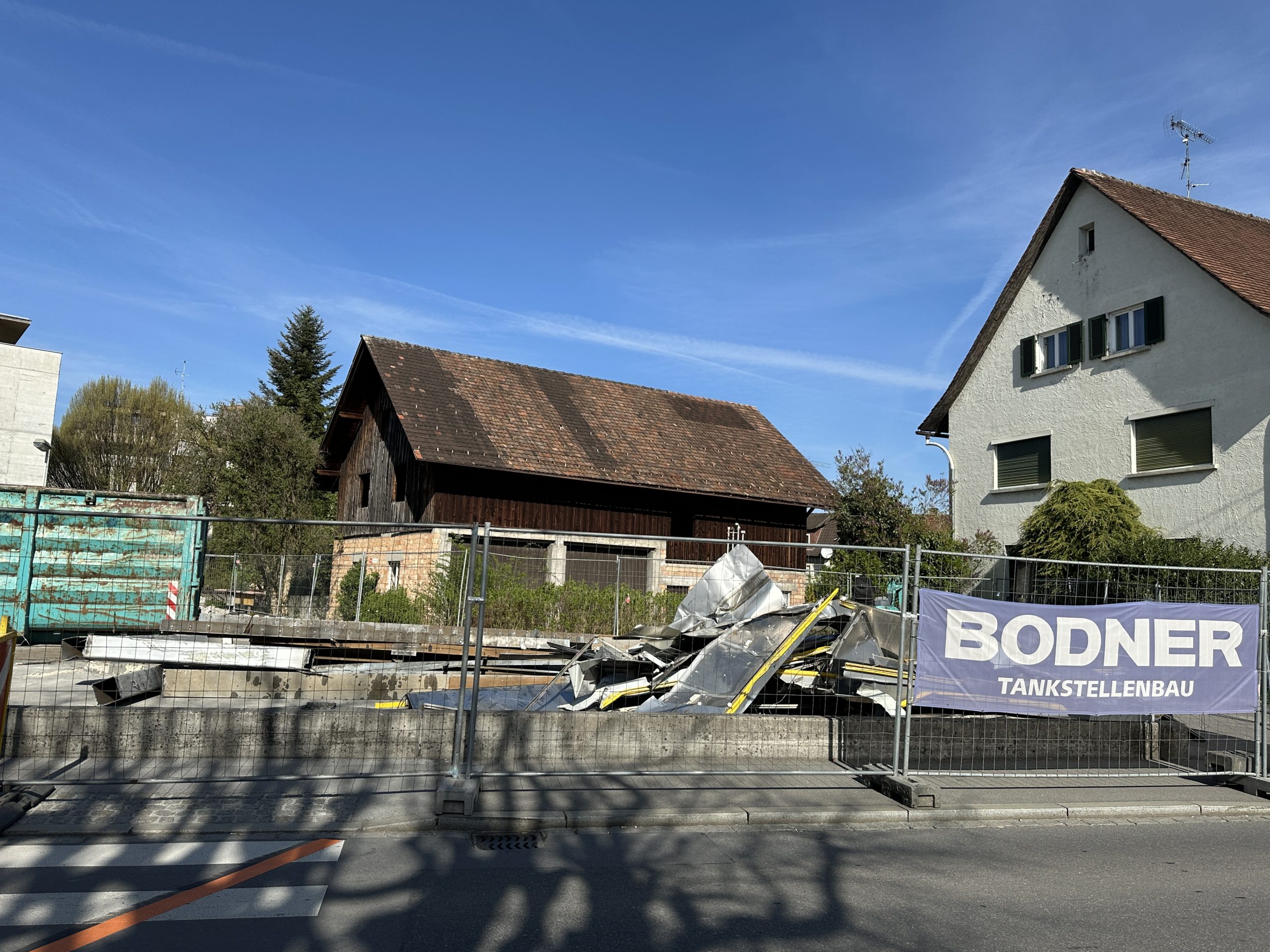 Vor Ort war beim VOL.AT-Lokalaugenschein ein Bagger im Einsatz, der das Material zur Seite schafft. Auch Baucontainer standen auf dem Grundstück. Schilder verweisen auf das Unternehmen Bodner Tankstellenbau als ausführendes Unternehmen für den Abriss des Gebäudes. Das Gelände ist mit Bauzäunen abgesperrt.
