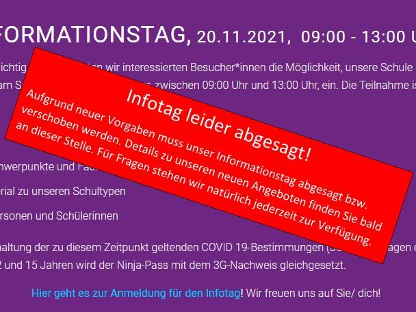 Aufgrund neuer Vorgaben muss unser Inforamtionstag abgesagt bwz. verschoben werden. Details zu7 unseren neuen Angeboten finden Sie bald an dieser stelle. Für Fragen stehen wir natürlich jederzeit zur Verfügung!