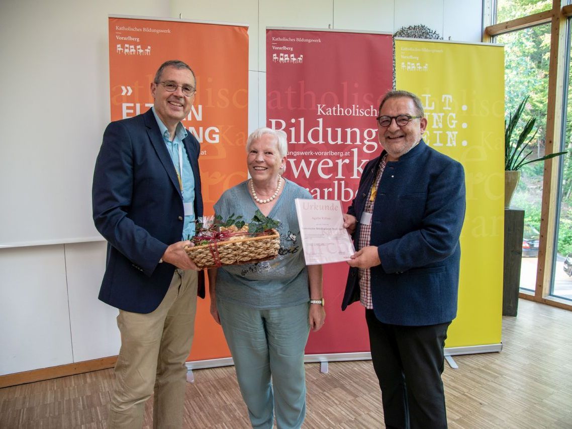 Dafür wurde sie am 7. Juni 2019 bei der Jahreshauptversammlung des Katholischen Bildungswerks durch den Obmann, Hanno Platzgummer, und den Geschäftsführer feierlich geehrt. Sie sprachen ihren großen Dank aus und überreichten ein kleines Geschenk.