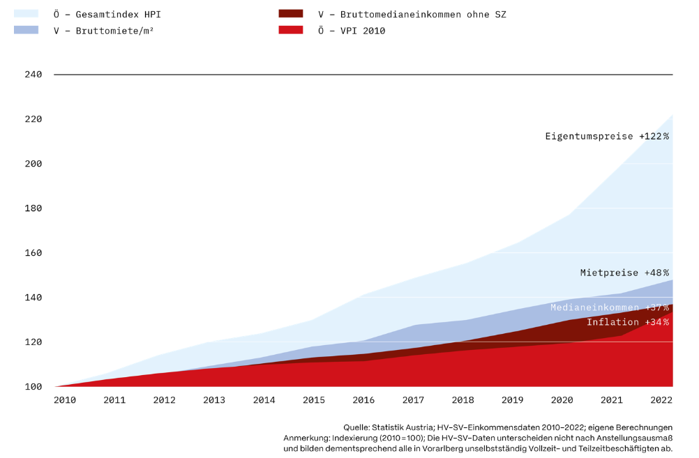 Das wird sich wohl so schnell auch nicht ändern: Nach Berechnungen der AK Vorarlberg auf Grundlage von Daten der Statistik Austria können sich nur 10 bis 15 Prozent der bestverdienenden Haushalte in Vorarlberg überhaupt noch Wohneigentum leisten – und auch nur, wenn sie ab Arbeitsantritt eisern sparen und sich bis zur Pension verschulden. Reichte 2010 noch ein Kredit in Höhe des sechsfachen Jahreseinkommens für ein Eigenheim, so müssen Käufer:innen heute bereits einen Kredit in Höhe des zehn- bis zwölffachen Jahreseinkommens aufnehmen – also gut doppelt so viel, ist den Analysen der Nationalbank zu entnehmen.