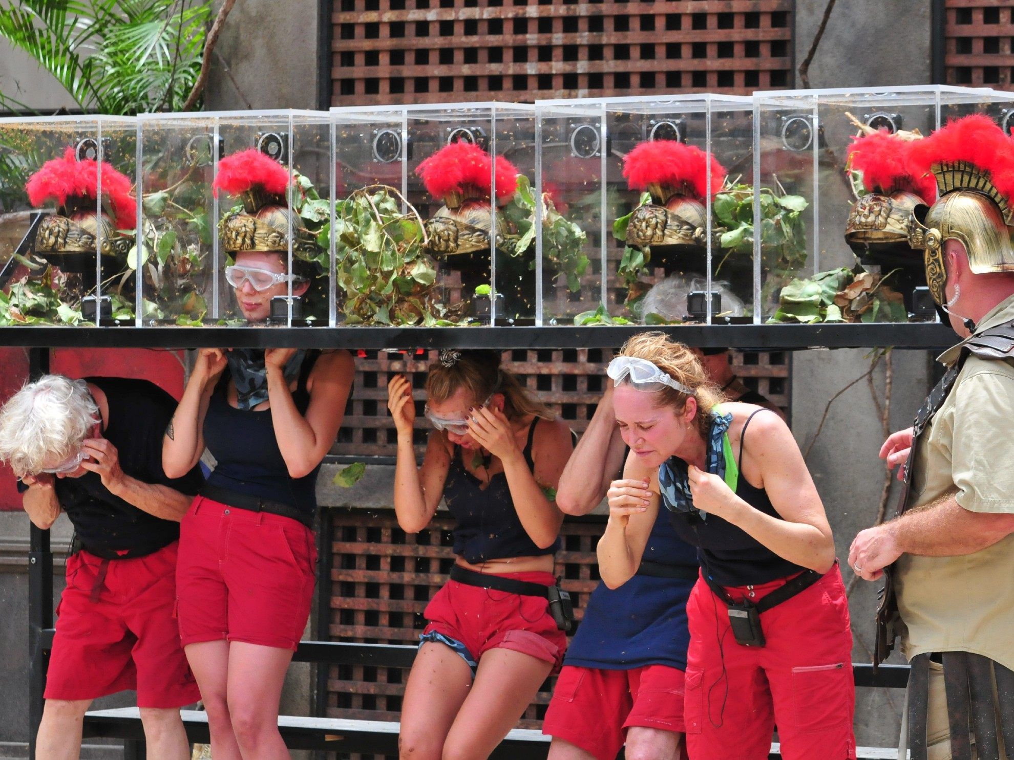 Am Sonntag traten alle zehn verbliebenen Teilnehmer zur Dschungelprüfung an, einige mussten ihren Kopf minutenlang in eine Box mit grünen Ameisen stecken.