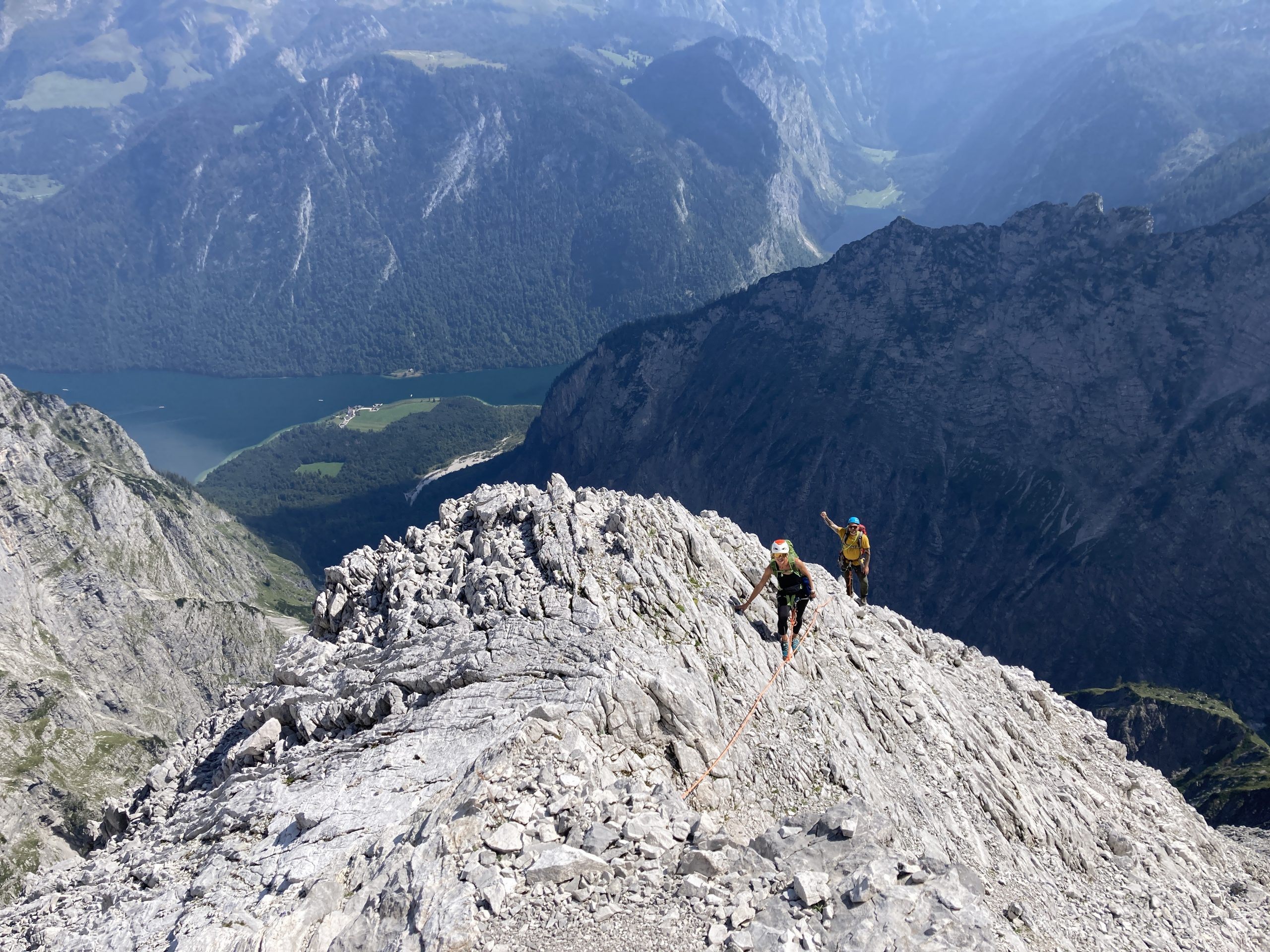 Am wunderschönen Königssee setzten wir mit dem Boot samt „Echowand-Einlage“ nach St. Bartholomä über. Nach kurzer Nacht im Ostwandlager wird um 4.30 Uhr zur längsten Kletterwand der Ostalpen gestartet – 1.800 Hm lagen vor uns! Ein großartiger alpiner Klassiker. Geht es hier wirklich nach oben? Die Wegfindung ist eine große Herausforderung, doch wir bewahrten stets den Überblick. Der Südgipfel mit herrlichem Rundblick ist dann nach mehreren Stunden erreicht. Was für ein Erfolg!
