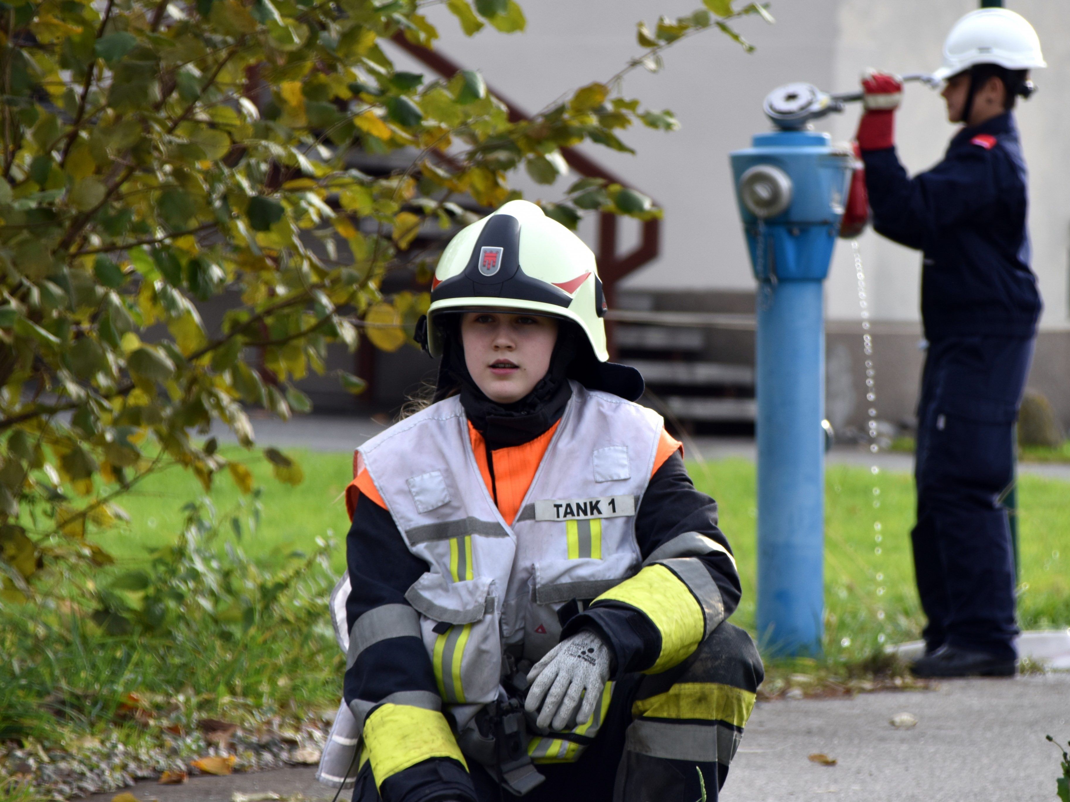 Mitten im Szenario musste die Übung unterbrochen werden da sich ein Feuerwehrmann durch ein herabstürzendes Teil vom Dach verletzte.