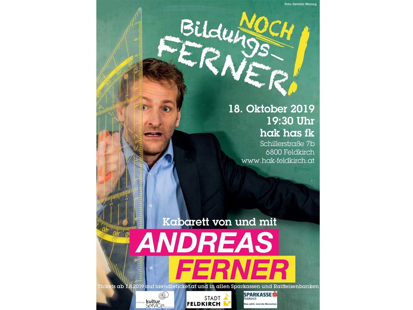 Am 18. Oktober 2019 um 19:30 Uhr feiert das Kabarettprogramm „NOCH BildungsFERNER” in der Aula der Bundeshandelsakademie Feldkirch seine Vorarlberg-Premiere.