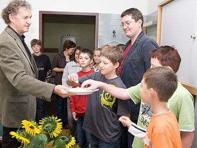 Der gebürtige Wolfurter bereitet seinen 73 Erstklässlern einen wahrhaft herzlichen Empfang. Nach dem kurzen Antrittsbesuch im Direktionsbüro, bei dem Edgar Natter den noch etwas scheu wirkenden Mädchen und Buben gut zuredet, verteilt er rosa und weiße Zuckerherzen. Das süße Einstandsgeschenk wird gerne angenommen.