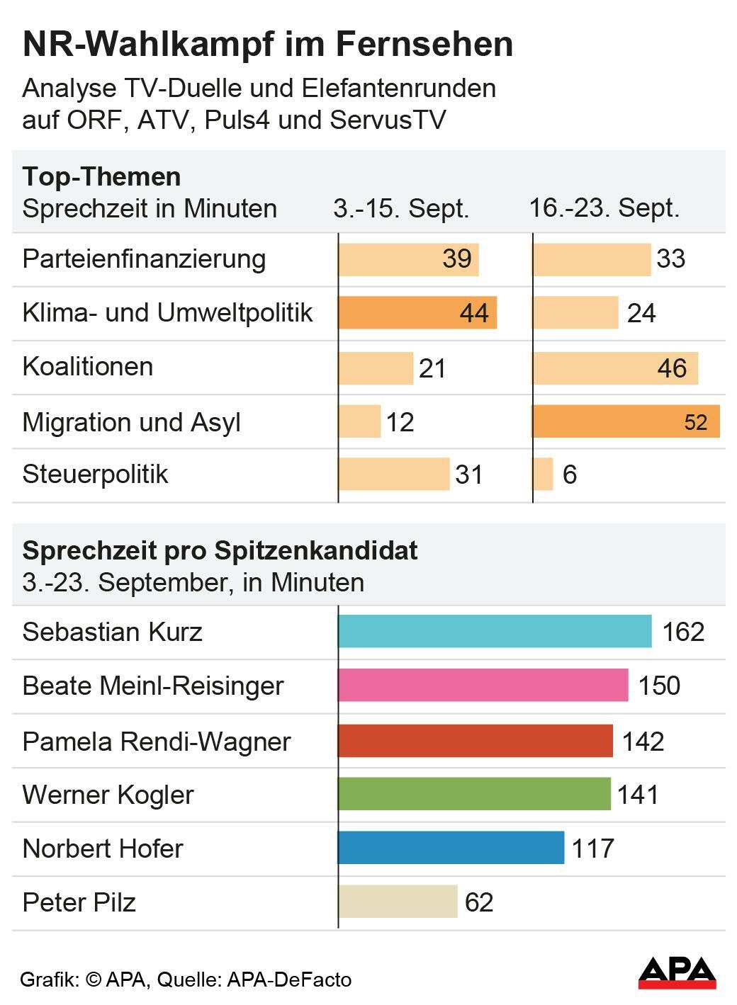 Die Parteienfinanzierung sowie die Klima- und Umweltpolitik waren die dominierenden Themen im TV-Wahlkampf zur Nationalratswahl. Dahinter folgen auf den Plätzen drei und vier die Koalitionsfrage und Migration und Asyl, die vor allem im Wahlkampffinale stark an Bedeutung gewannen. Das ergab eine Analyse der TV-Duelle und Elefantenrunden auf ORF, ATV, Puls 4 und Servus TV durch APA DeFacto.