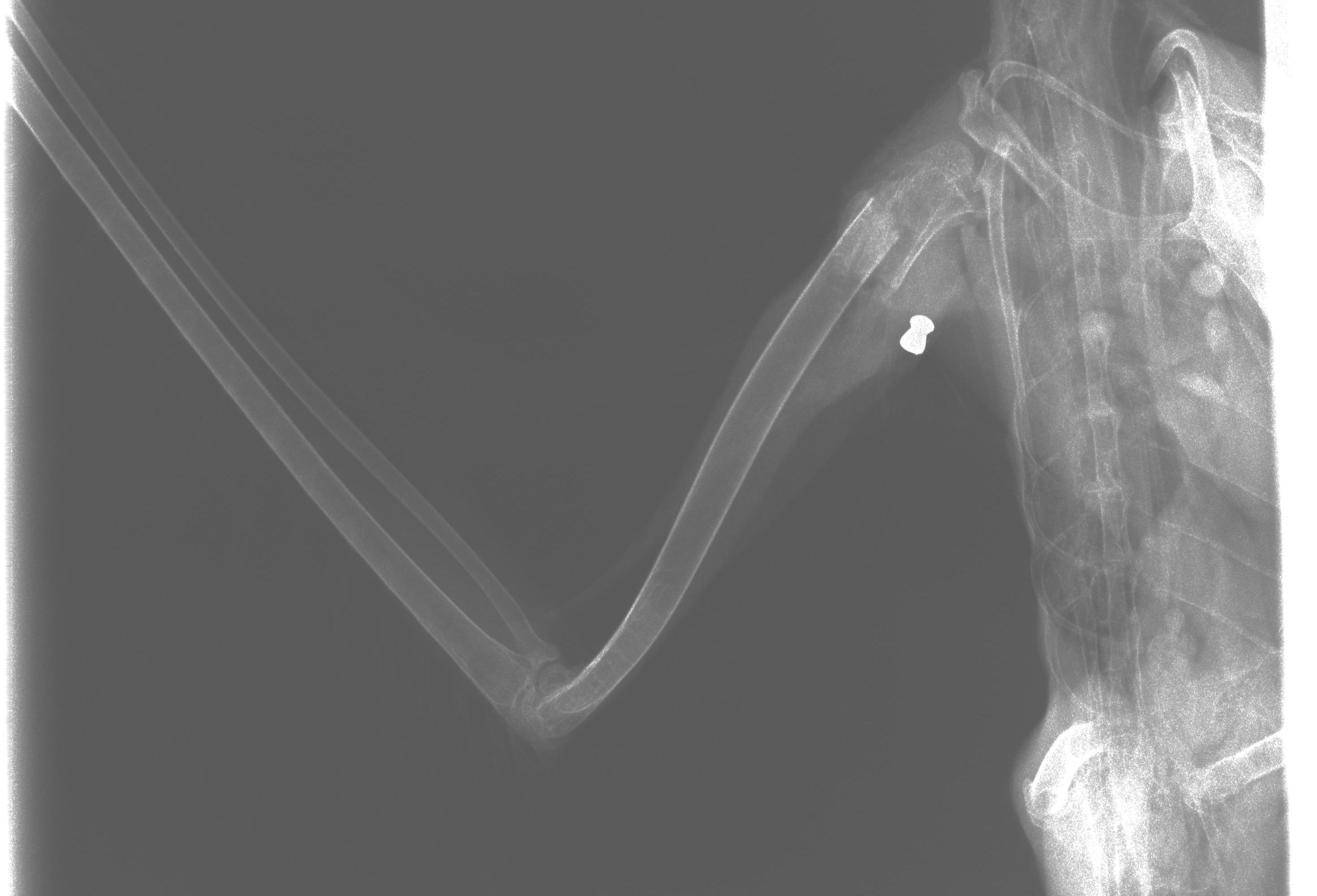 Bereits beim Fund war eine schwere Verletzung des Vogels an einem Flügel erkennbar gewesen. Im Rahmen einer Untersuchung wurde dann im Schultergelenk das Projektil eines Luftdruckgewehrs gefunden. "Aufgrund der Schwere der Verletzung konnte der Flügel nicht amputiert werden und das Tier musste leider euthanasiert werden", hieß es in der Aussendung.