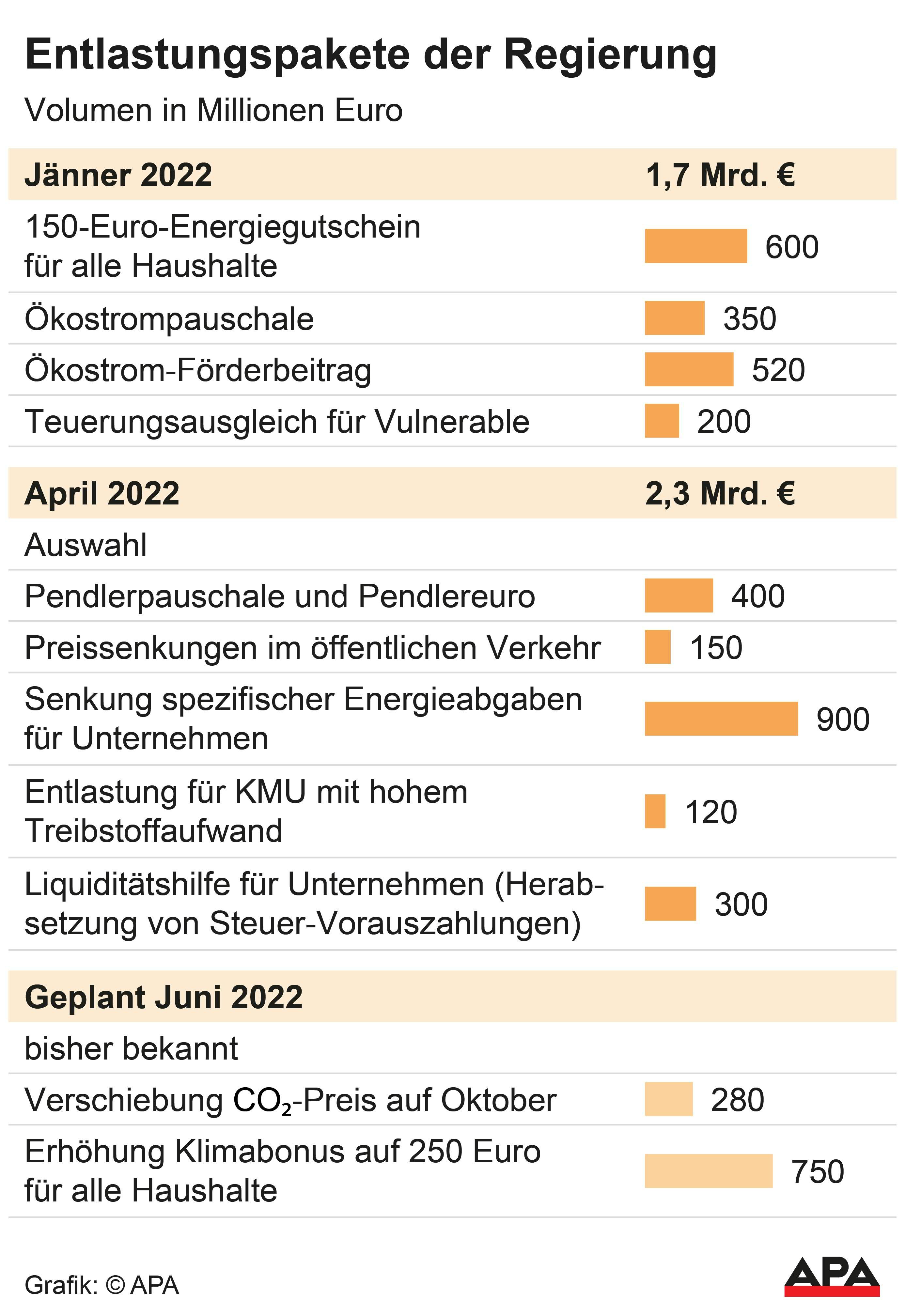 Im Jänner beschloss die Regierung ein Paket im Ausmaß von 1,7 Mrd. Euro. 600 Mio. Euro davon kostete der Energiekostenausgleich, der in Form von 150-Euro-Gutscheinen an alle Haushalte erging. Besonders Bedürftige wie Arbeitslose, Mindestsicherungs- und Ausgleichszulagenbezieher erhielten zudem einen Teuerungsausgleich von 300 Euro, das kostete 200 Mio. Euro. Das Aussetzung der Ökostrompauschale und des Ökostromförderbeitrags für heuer - von im Schnitt rund 100 Euro pro Haushalt -, kostete weitere 900 Mio. Euro. Die Ökostrompauschale schlug sich mit 350 Mio. Euro, der Ökostrom-Förderbeitrag mit 520 Mio. zu Buche.