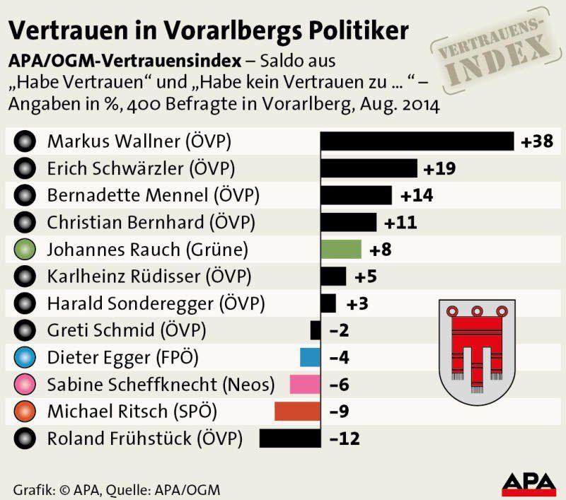 Wallners Saldo aus Vertrauens- und Misstrauenswerten ergibt ein Plus von 38. Mit Respektabstand Platz zwei in der unter 400 Vorarlbergern durchgeführten OGM-Untersuchung nimmt Langzeit-Landesrat Erich Schwärzler ein. Auch die Plätze drei und vier gehen an Mitglieder der Landesregierung, nämlich an Bernadette Mennel und Christian Bernhard.
