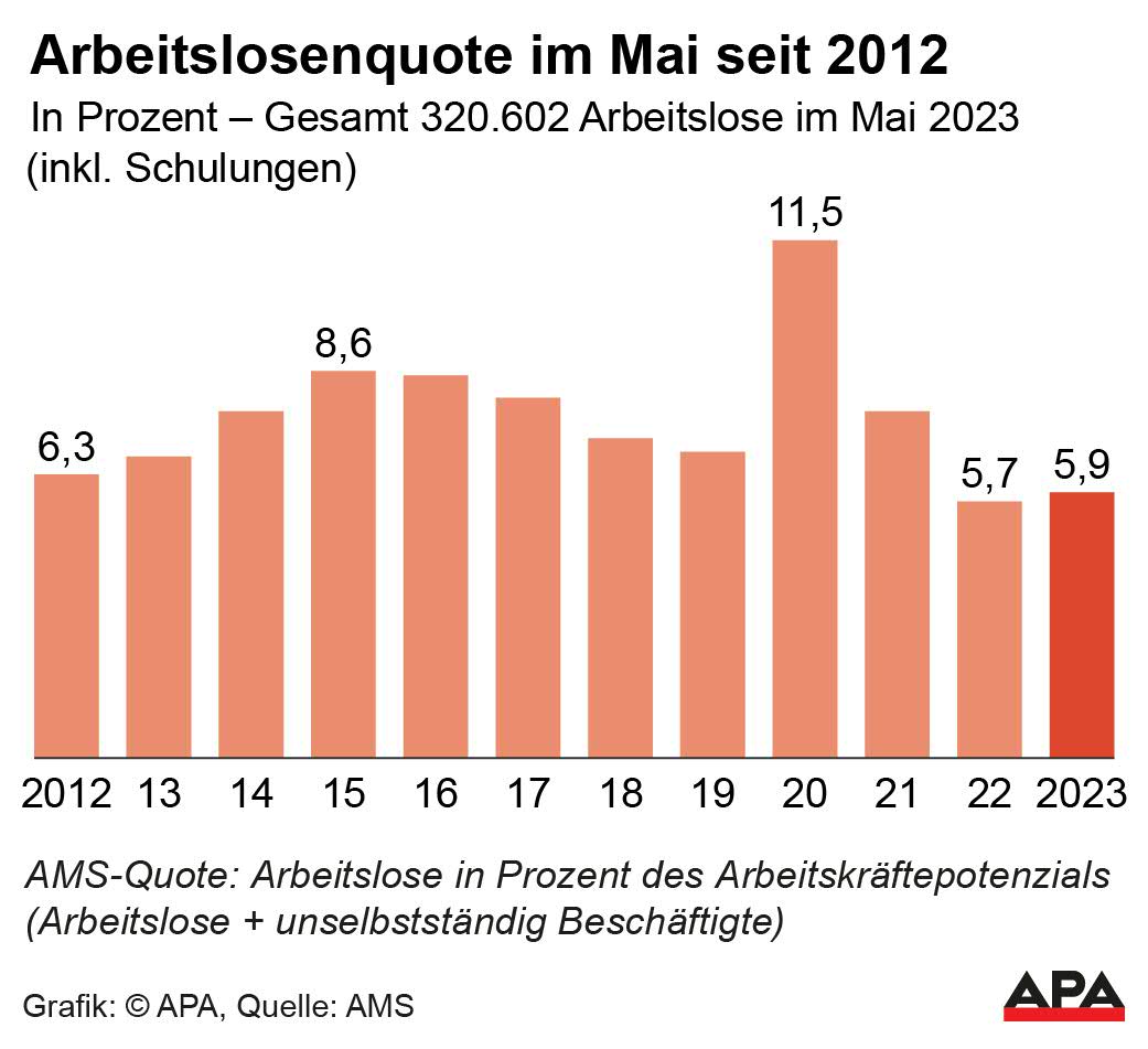 Ende Mai gab es im Vergleich zum Vorjahresmonat um 2,9 Prozent mehr Personen ohne Job. Arbeitslose und Schulungsteilnehmer zusammengerechnet waren 320.602 Personen (+9.059) ohne Beschäftigung. Die Arbeitslosenquote erhöhte sich leicht um 0,2 Prozentpunkte auf 5,9 Prozent. Die Arbeitslosigkeit war im April im Jahresabstand das erste Mal seit zwei Jahren gestiegen.